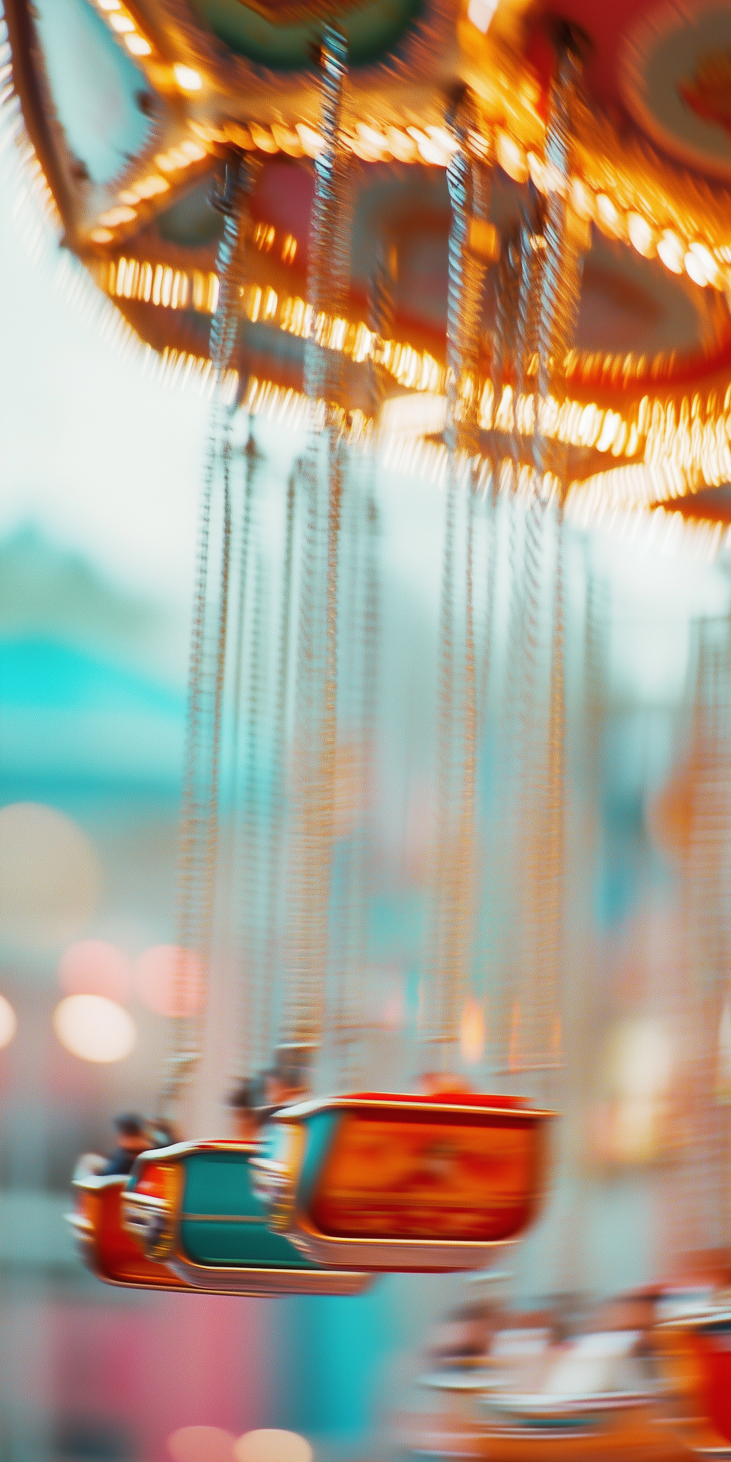 Blurred carousel swing ride with vibrant lights and colors, capturing motion and excitement at an amusement park.