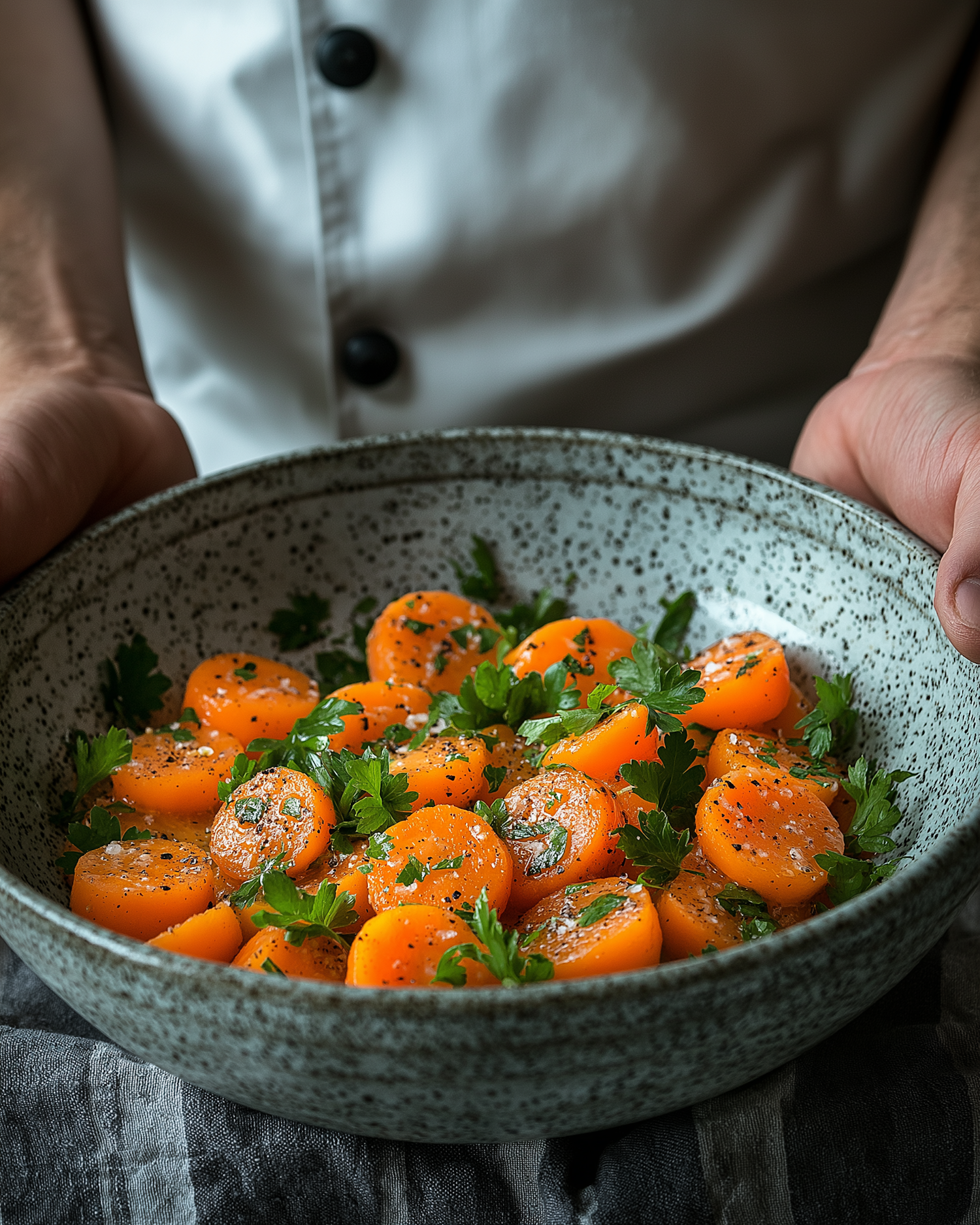 Bright orange carrot slices with parsley garnish in a rustic bowl, held by a chef in a white coat. Perfect for food lovers!