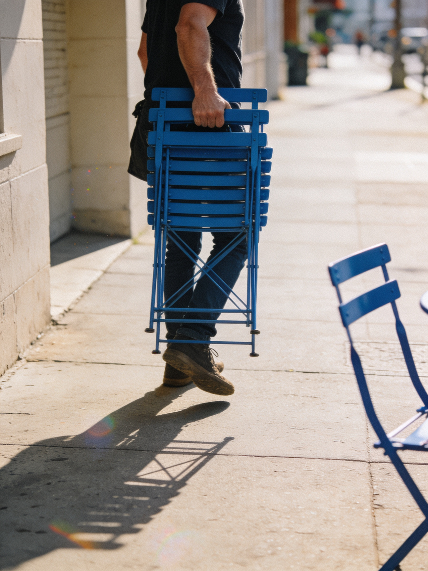 Cinematic street photography, warm daylight realism, natural documentary moment, muted surroundings with blue folding chairs as dominant accent, gentle film grain, subtle halation, shallow depth of field, 35mm lens look. A person carrying stacked blue folding chairs along a sidewalk, warm sunlight casting soft shadows, neutral walls around. No logos, no readable text, no brand names.
