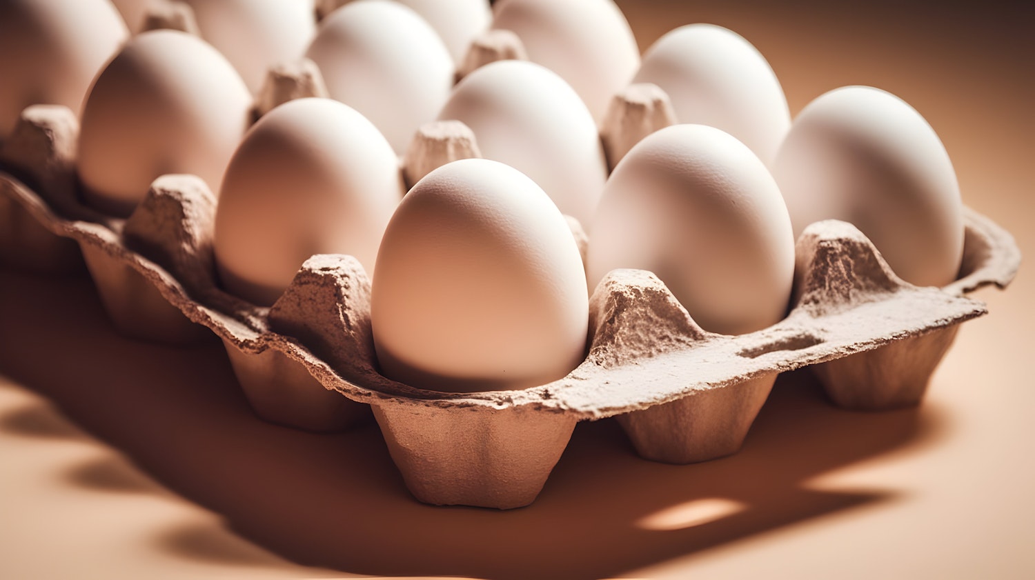 Close-up of white eggs in a cardboard tray with warm lighting, showcasing their smooth texture and natural sheen.