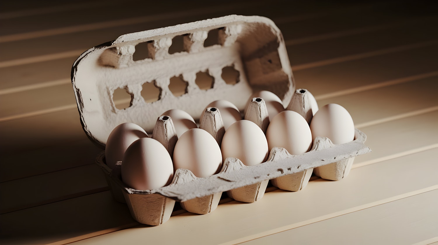 A carton of ten white eggs on a beige wooden surface, bathed in soft, warm lighting for a natural and minimalistic look.