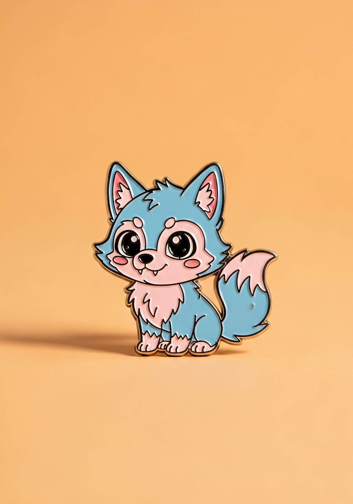 Adorable enamel pin of a cartoon blue fox with pink accents on a peach background, perfect for collectors or as a cute accessory.