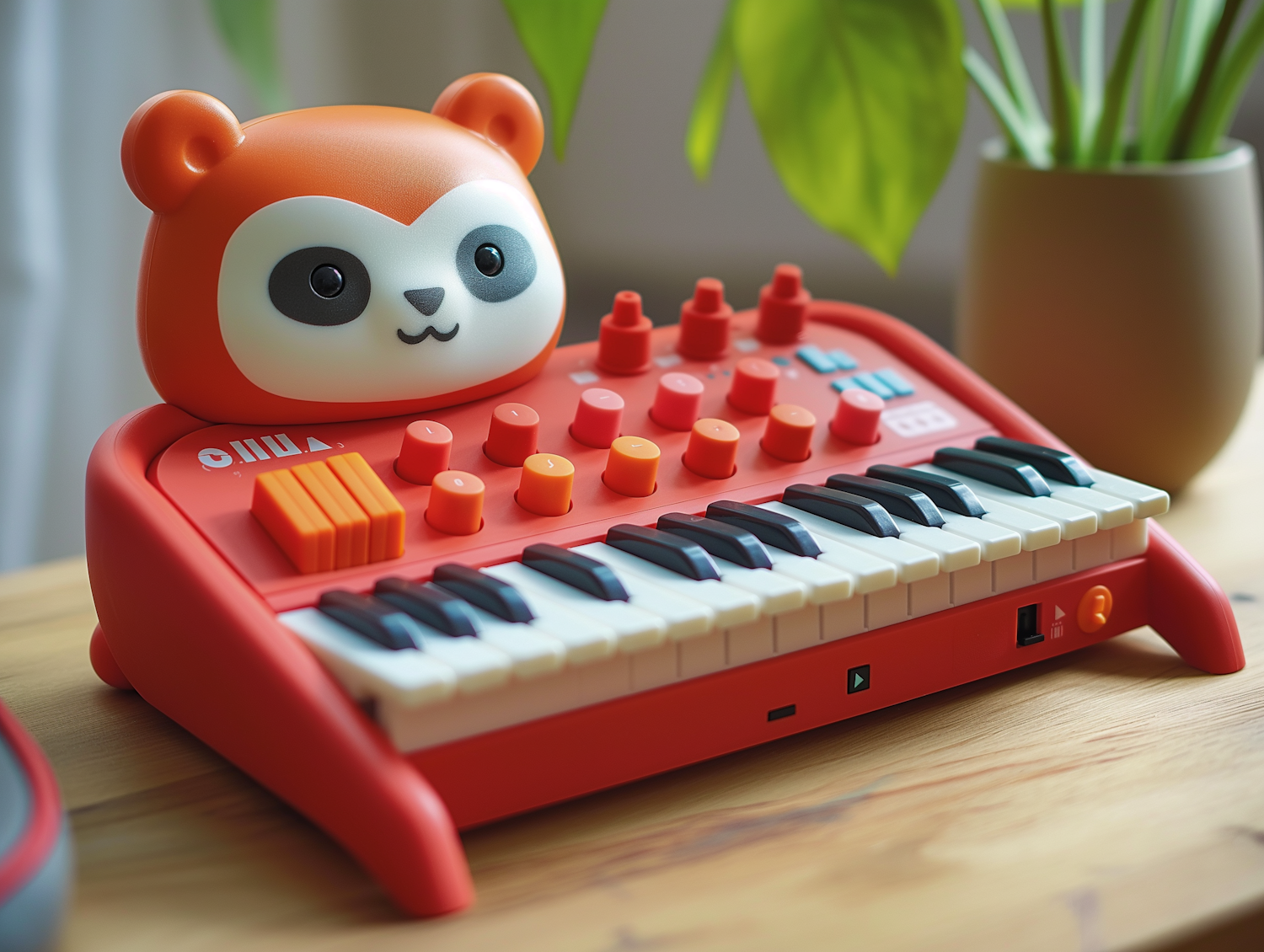 Cute animal-themed toy synthesizer with colorful knobs and keys, perfect for playful music exploration.