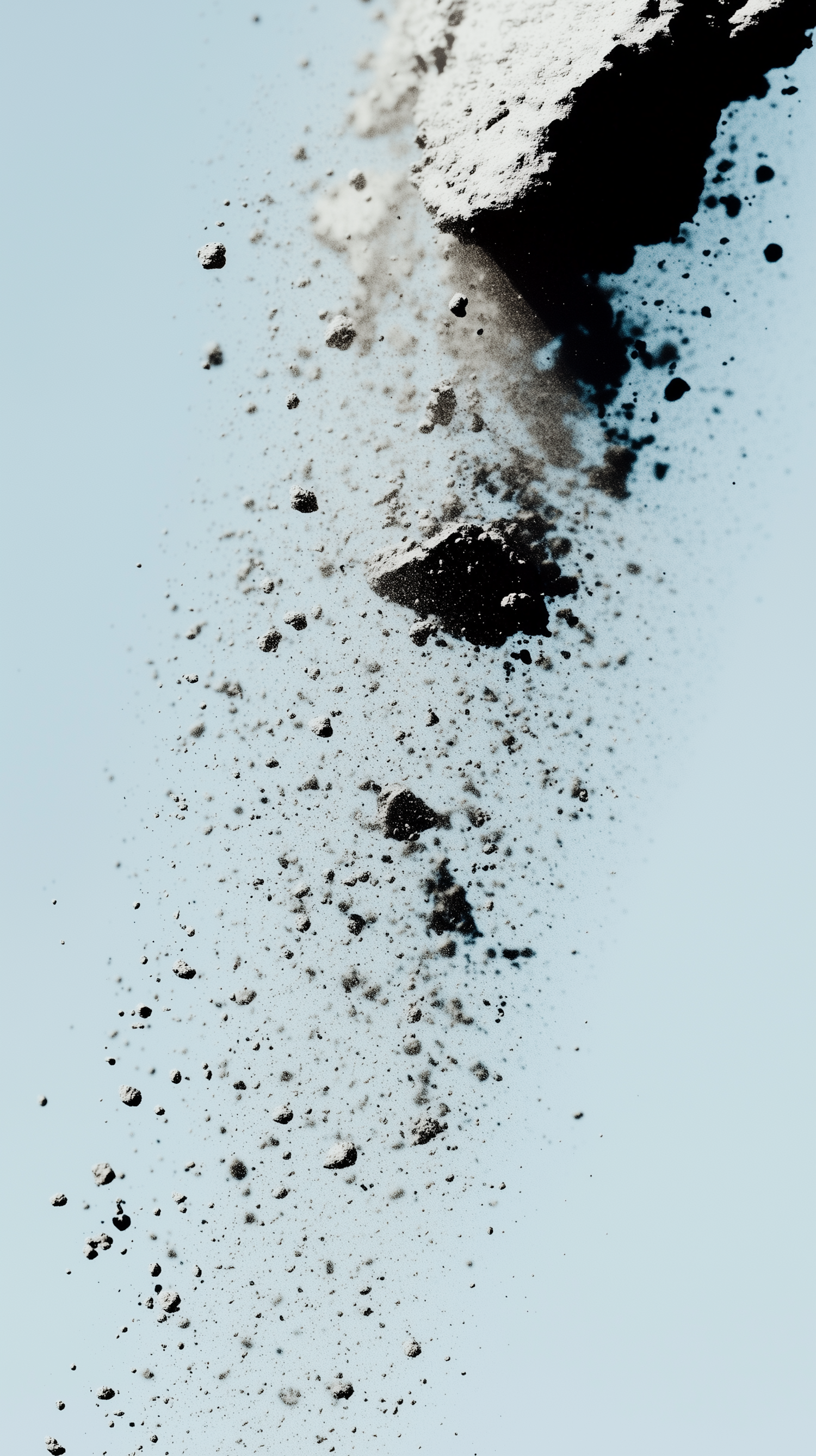 Crumbling debris in motion against a pale blue background, showcasing jagged rocks and fine dust scattering downward.