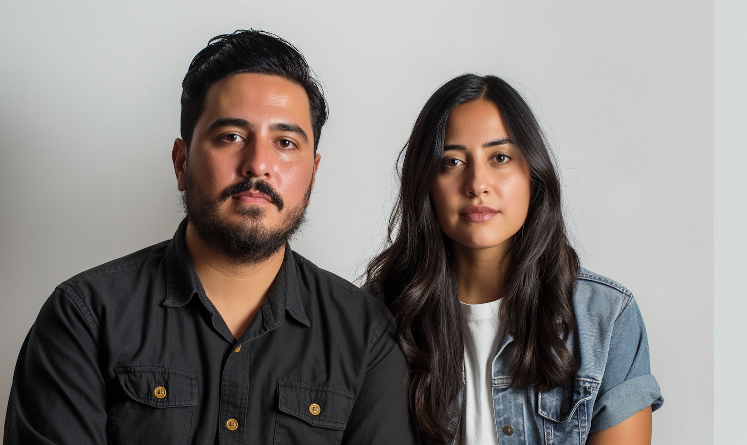 A man and woman with medium skin tones, wearing casual shirts, sit side by side against a plain background, looking directly at the camera.