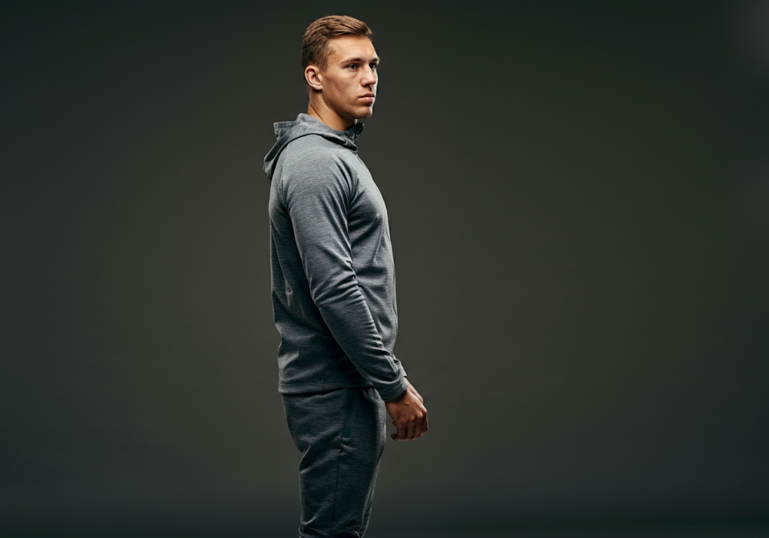 Young man in gray hoodie and sweatpants standing in profile against a dark background, showcasing a casual and athletic look.