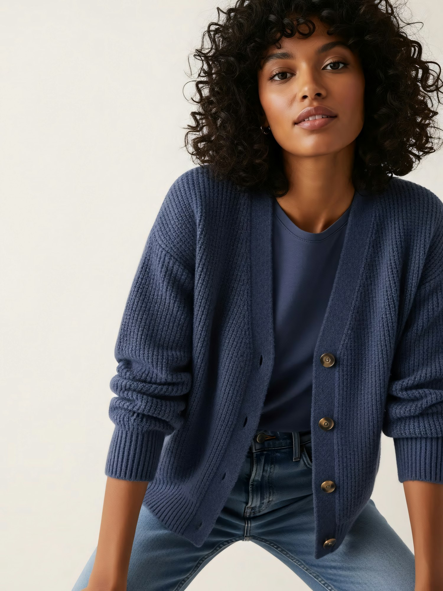 A stylish individual in a blue cardigan and jeans, showcasing a casual yet chic look with a neutral background.