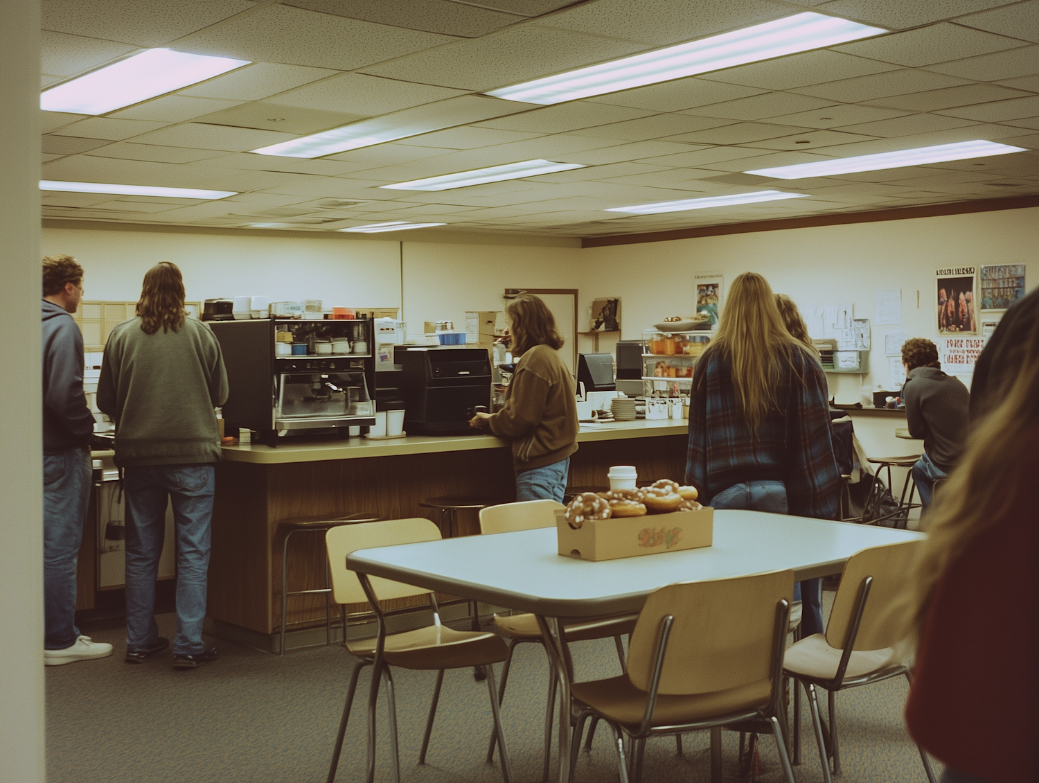 Casual gathering in a cafeteria with people enjoying coffee and donuts. Brightly lit room with posters on the walls.