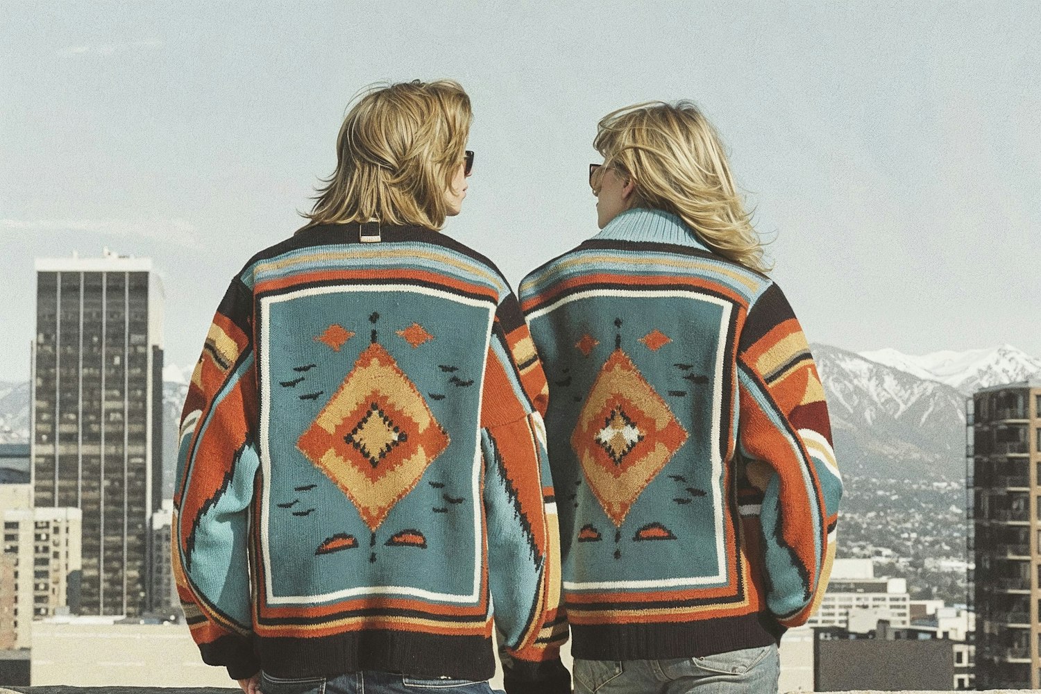 Two people in colorful geometric sweaters stand on a rooftop, overlooking a cityscape with mountains in the background.