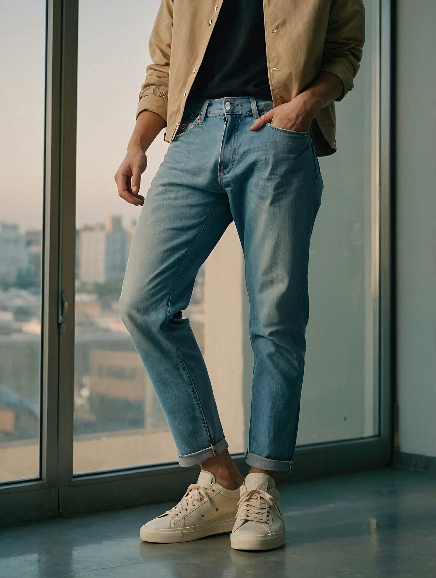 Casual outfit with light blue cuffed jeans, beige jacket, dark shirt, and off-white sneakers, styled near a window with a city view.