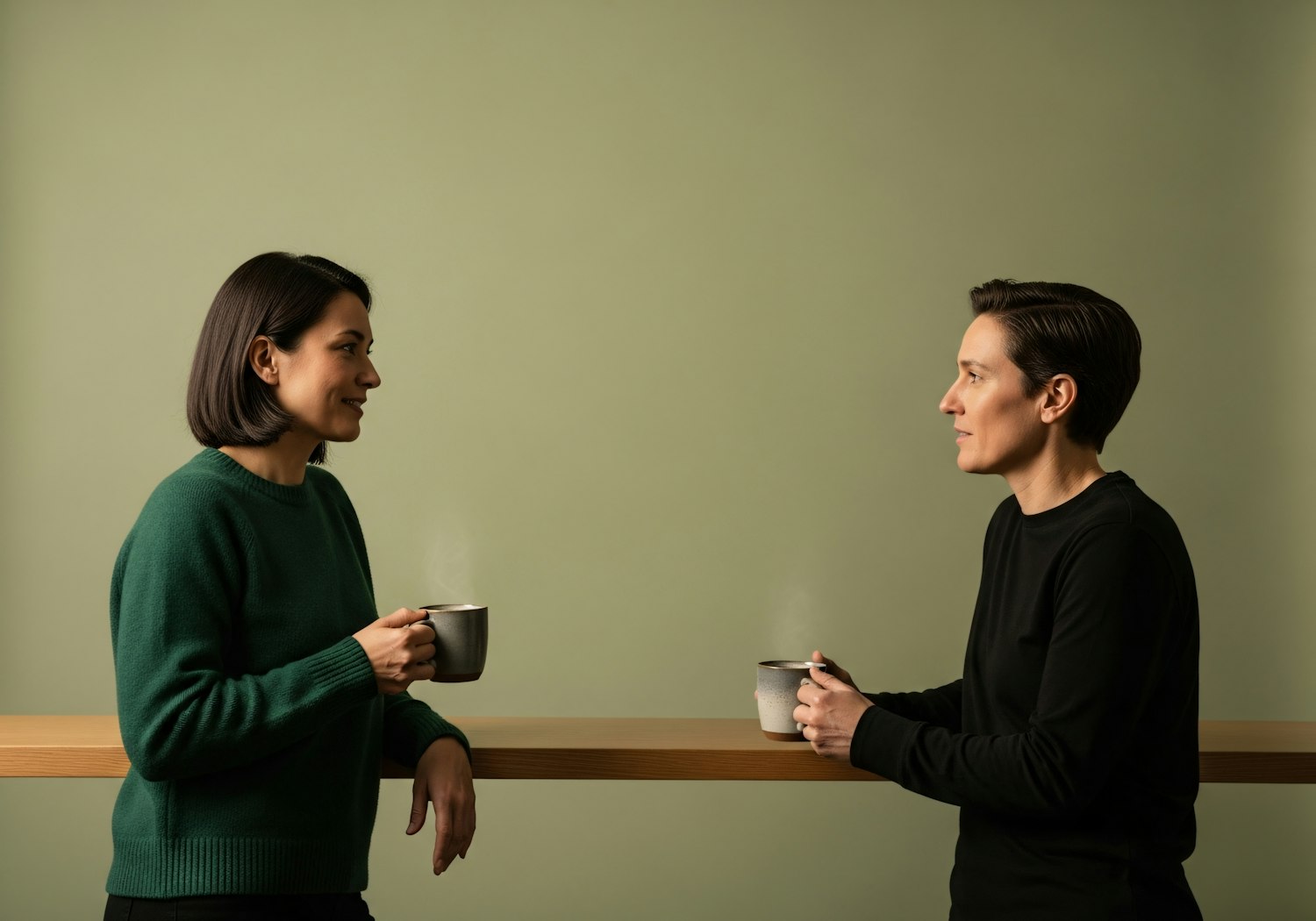 Two people having a friendly conversation over hot drinks, standing by a wooden counter against a muted green background.