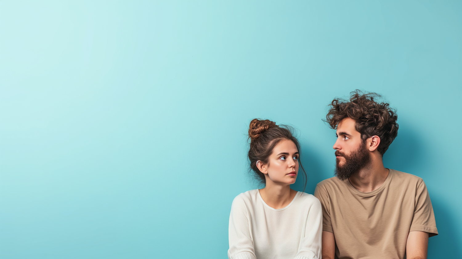 Young couple seated against a turquoise background, exchanging serious looks. Bright and minimalist composition.