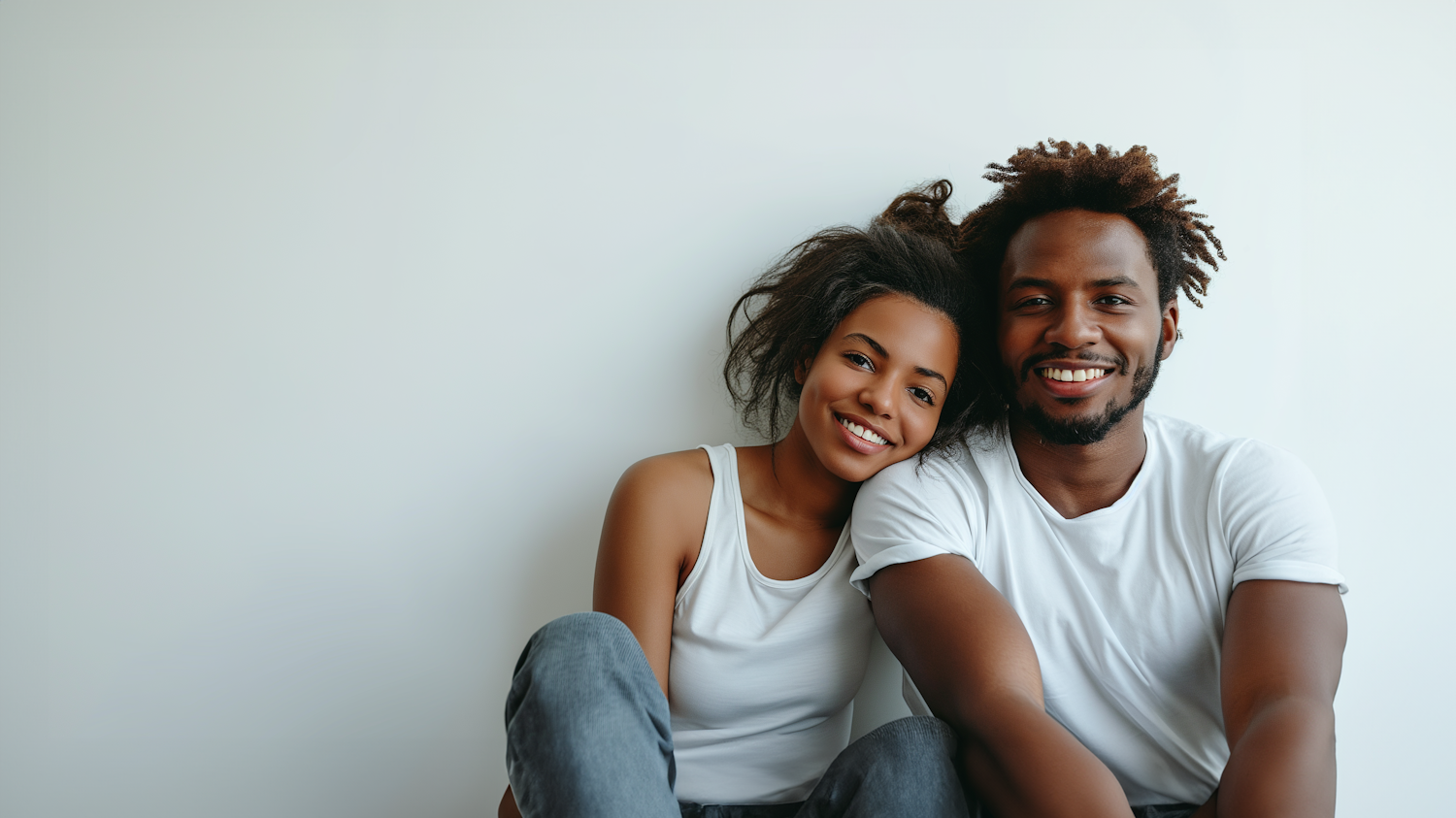 Smiling young Black couple sitting together against a white background, exuding warmth and happiness.
