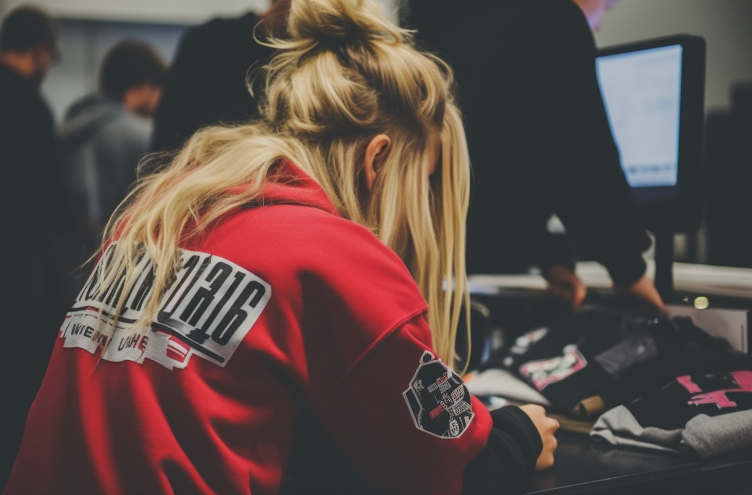 Young woman in a red hoodie with graphic print, focused on work in a busy indoor setting with blurred figures and a computer screen.