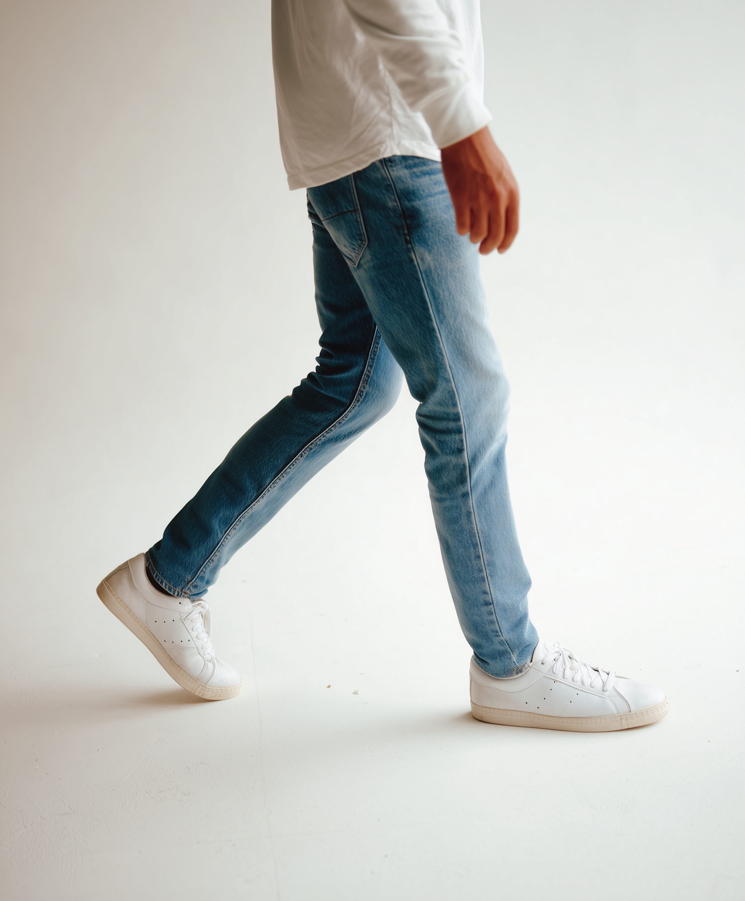 A person walking in light blue jeans and white sneakers, captured against a clean white background for a minimalist look.