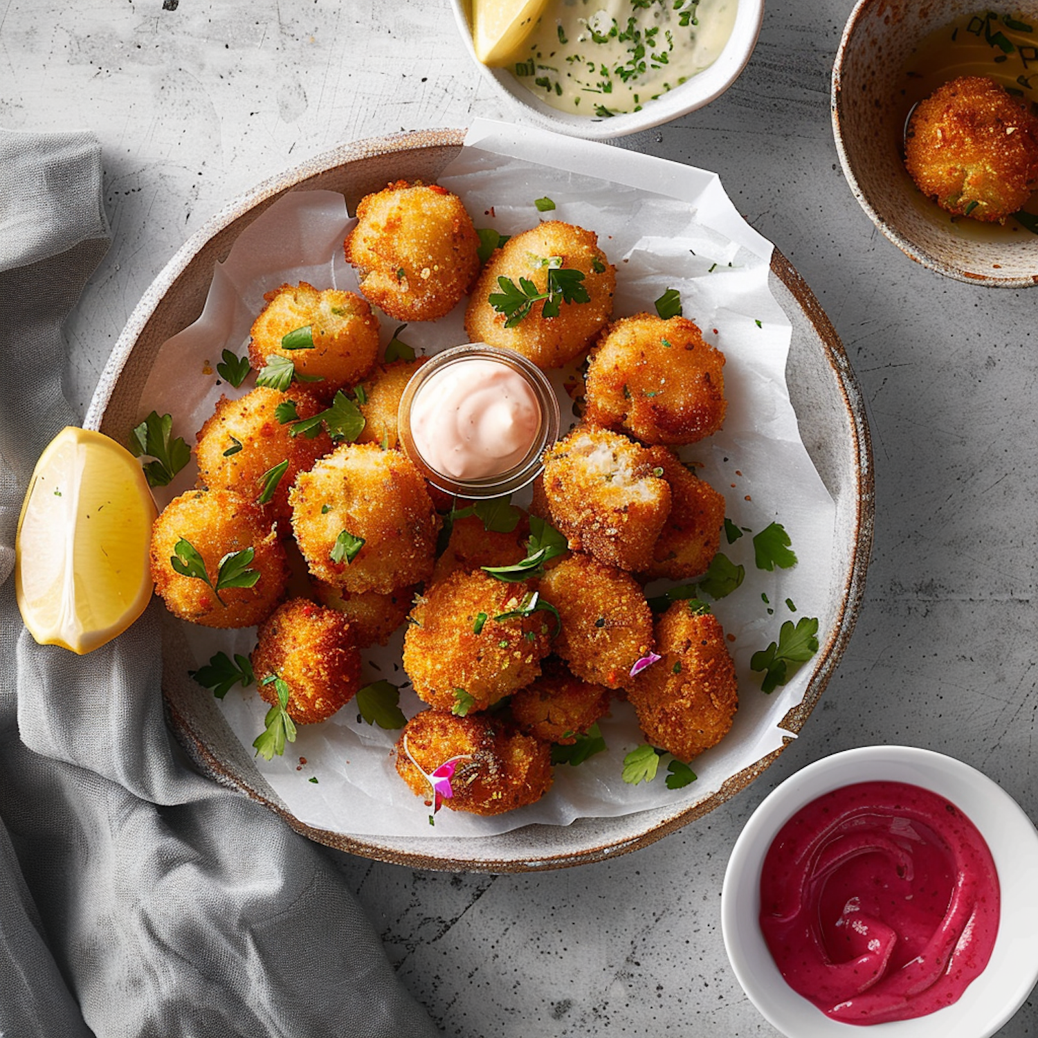 Golden croquettes with parsley and dipping sauces on a rustic plate, accompanied by lemon and vibrant sauces.