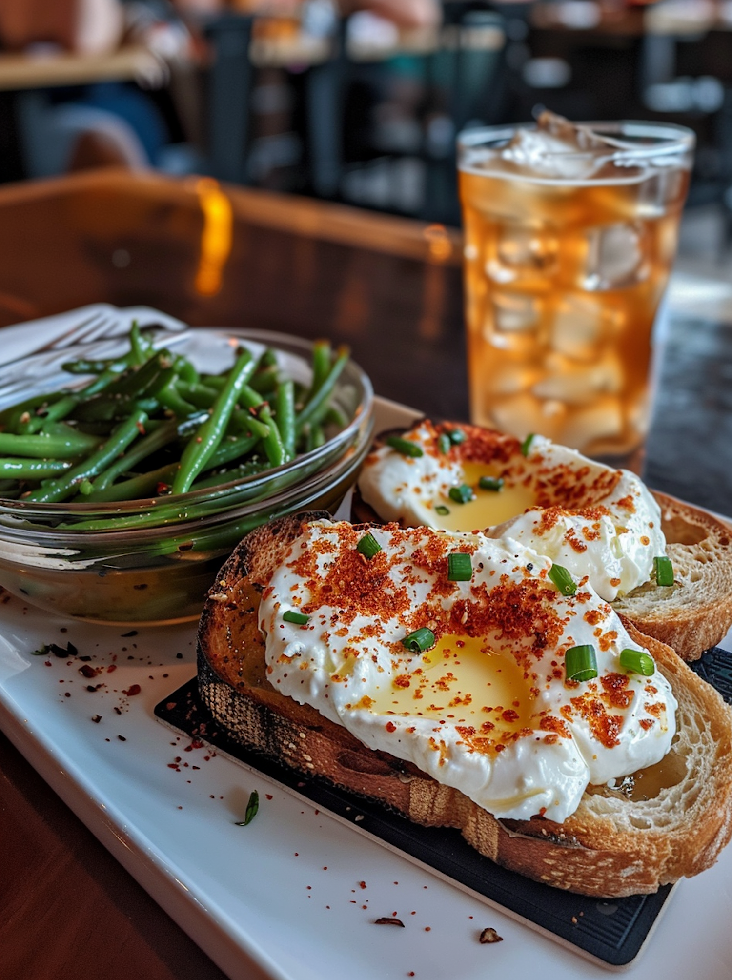 Toasted bread with creamy cheese, green beans, and iced tea in a cozy restaurant setting.