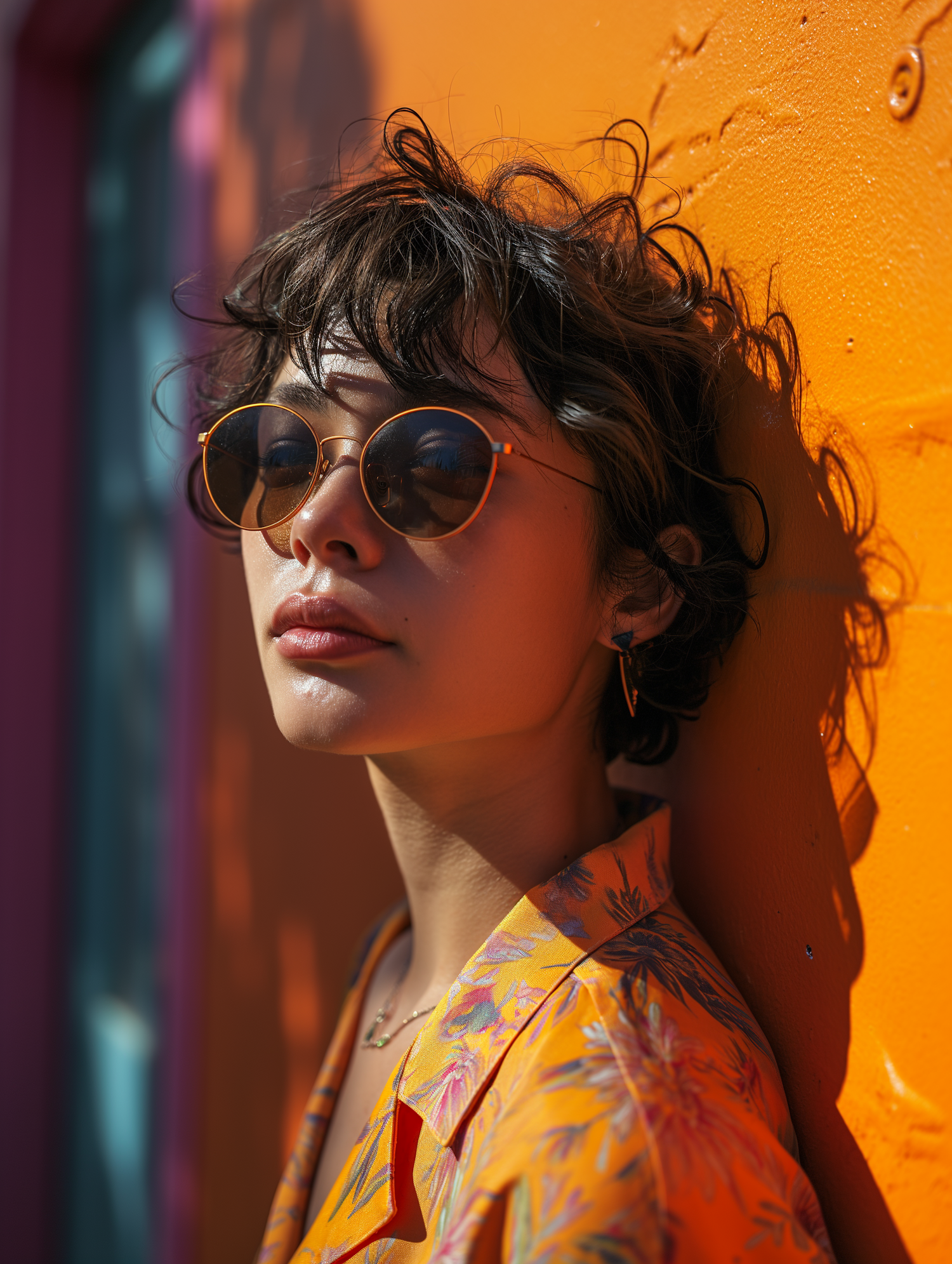 Stylish woman in sunglasses against a bright orange wall, wearing a floral shirt. Sunlight casts dramatic shadows, creating a vibrant scene.
