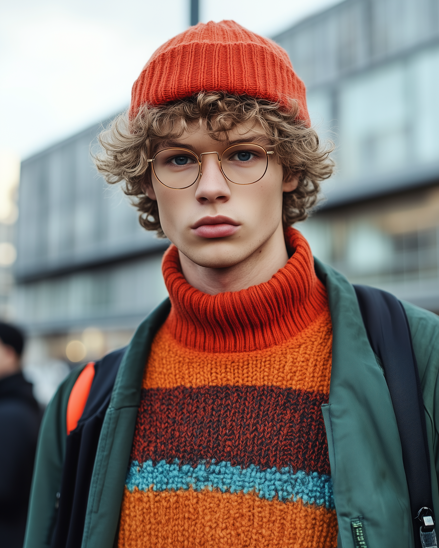 Young man with curly hair and glasses in orange knitwear and green jacket, standing in an urban setting.