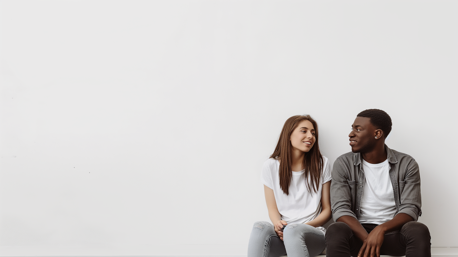 Young couple sitting against a white background, smiling and talking. Casual attire, friendly interaction, and ample space around them.