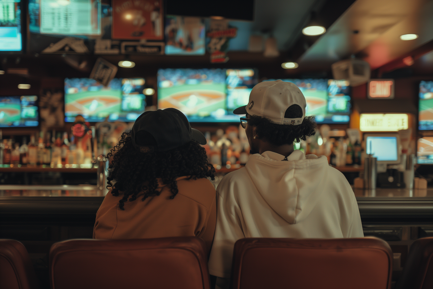 Two people in caps watch a baseball game on multiple screens at a cozy bar, creating a lively and engaging atmosphere.