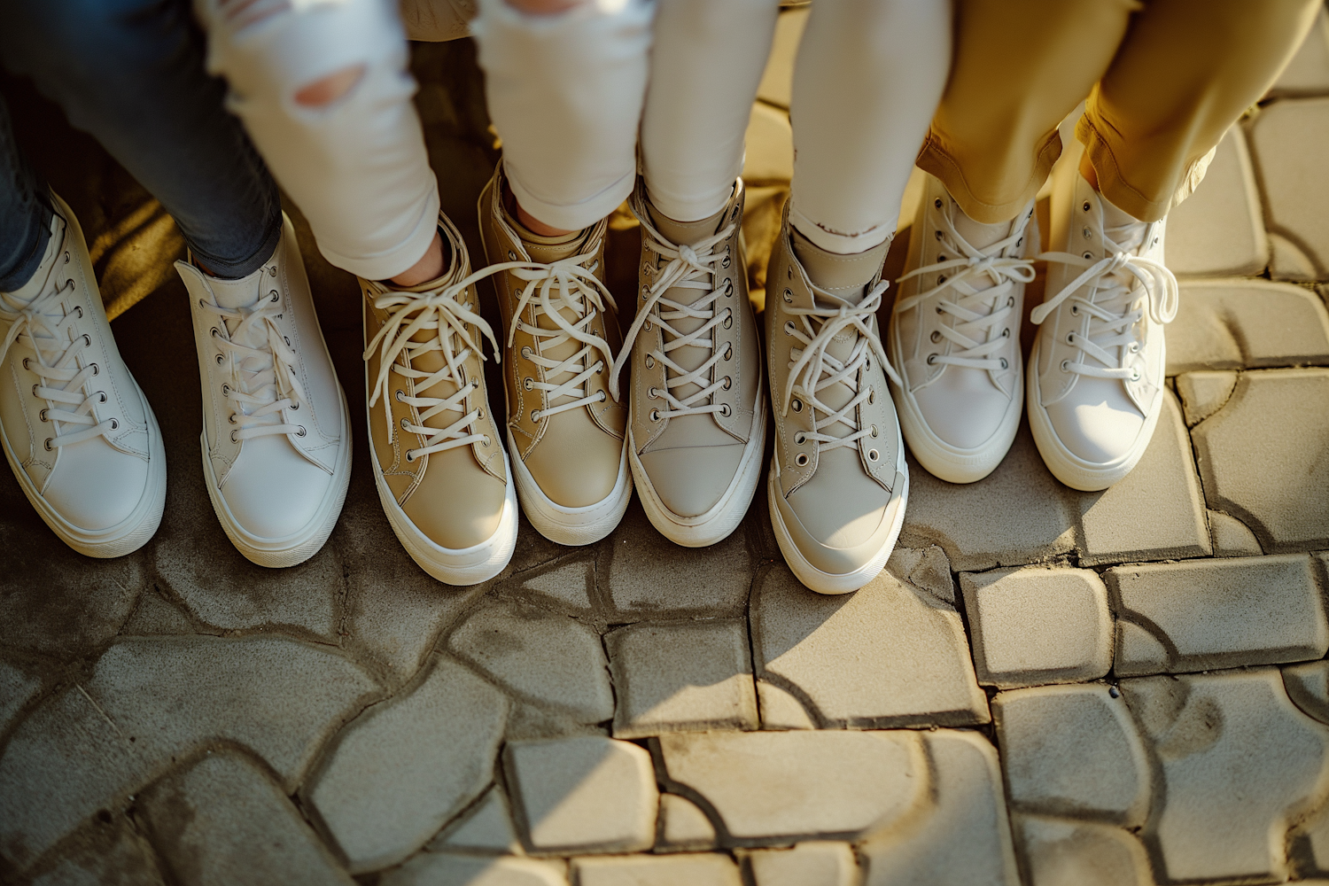 Five pairs of stylish sneakers in white and beige on a stone pavement, showcasing modern footwear fashion.