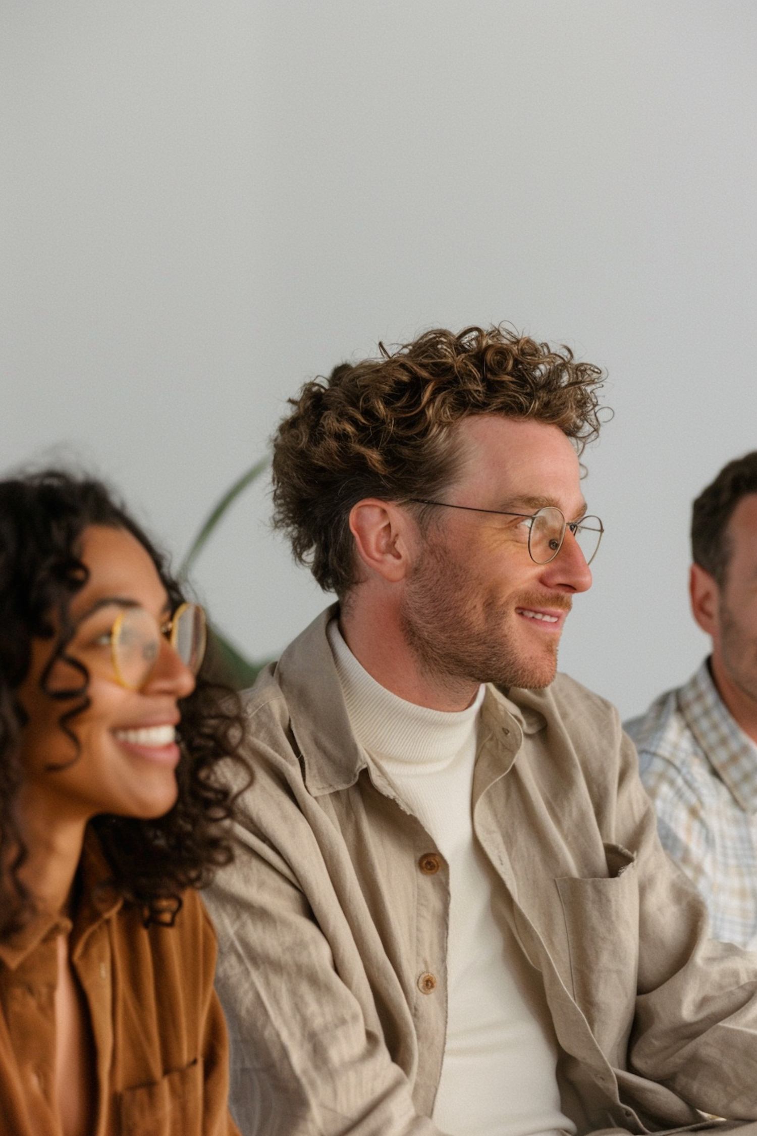 Three people in a casual setting, smiling and engaged in conversation, wearing glasses and neutral-toned clothing.