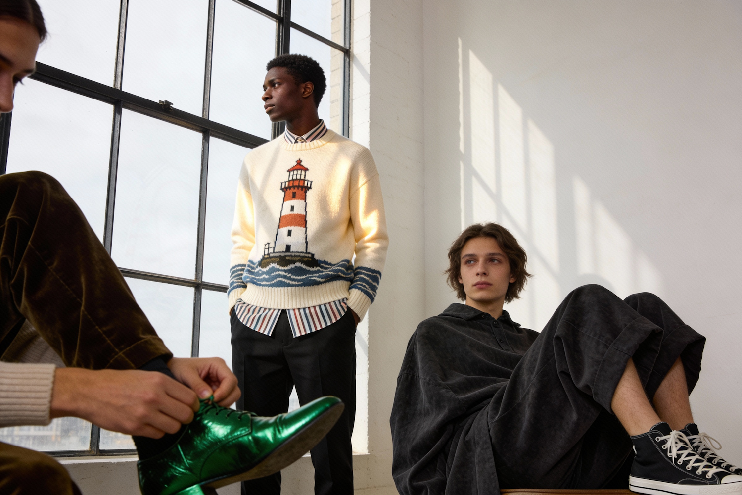 One Black individual stands near a window, gazing out while others remain seated. The lighthouse sweater catches the soft daylight, layered over the striped shirt and black pants. A colleague adjusts their green metallic shoes while seated. Another reclines slightly, wearing an oversized dark outfit and black-and-white sneakers. The mood is introspective and tactile, with suede, knitwear, and architectural shadows creating emotional depth