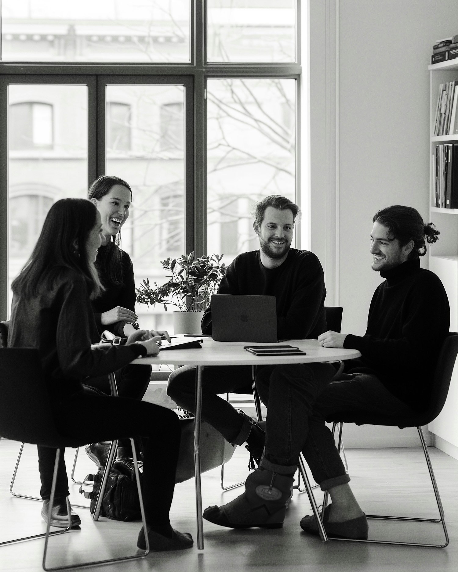 Four colleagues in a modern office setting, engaged in a lively discussion around a table with a laptop and notebook.