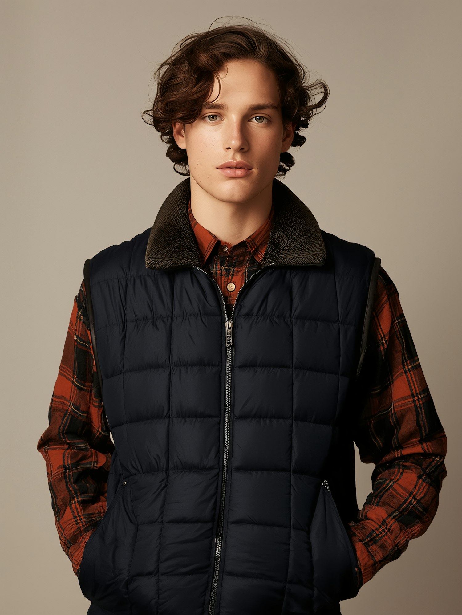 Young man in a navy quilted vest and plaid shirt, posing against a beige background with a calm expression.