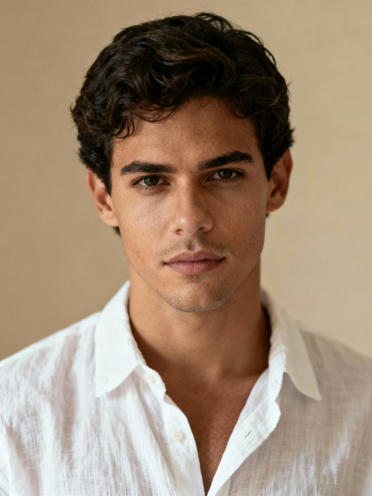 Close-up portrait of a young man with dark hair and a white shirt, set against a neutral beige background.