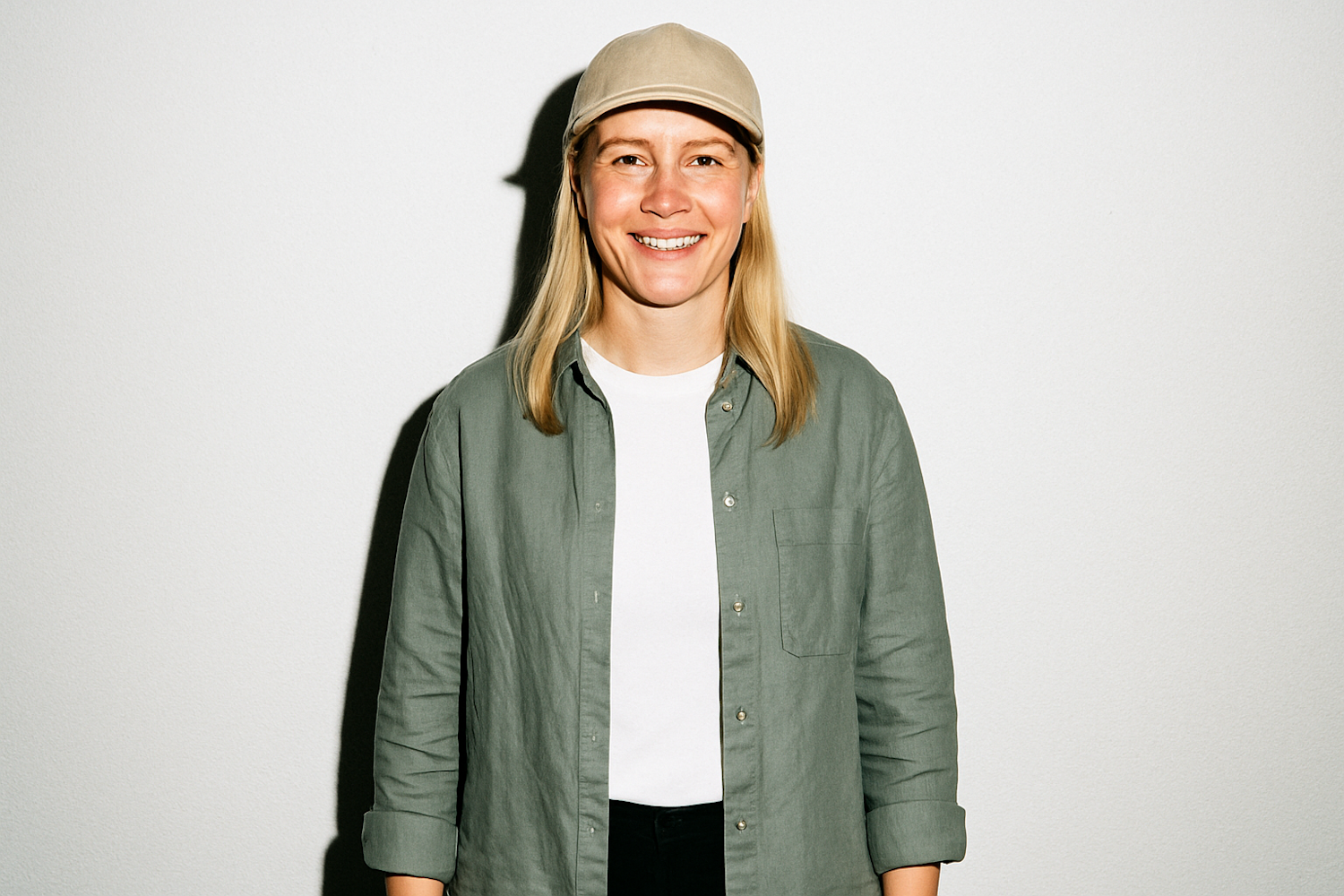 Smiling individual in a beige cap and green shirt against a white background, radiating a casual and approachable vibe.