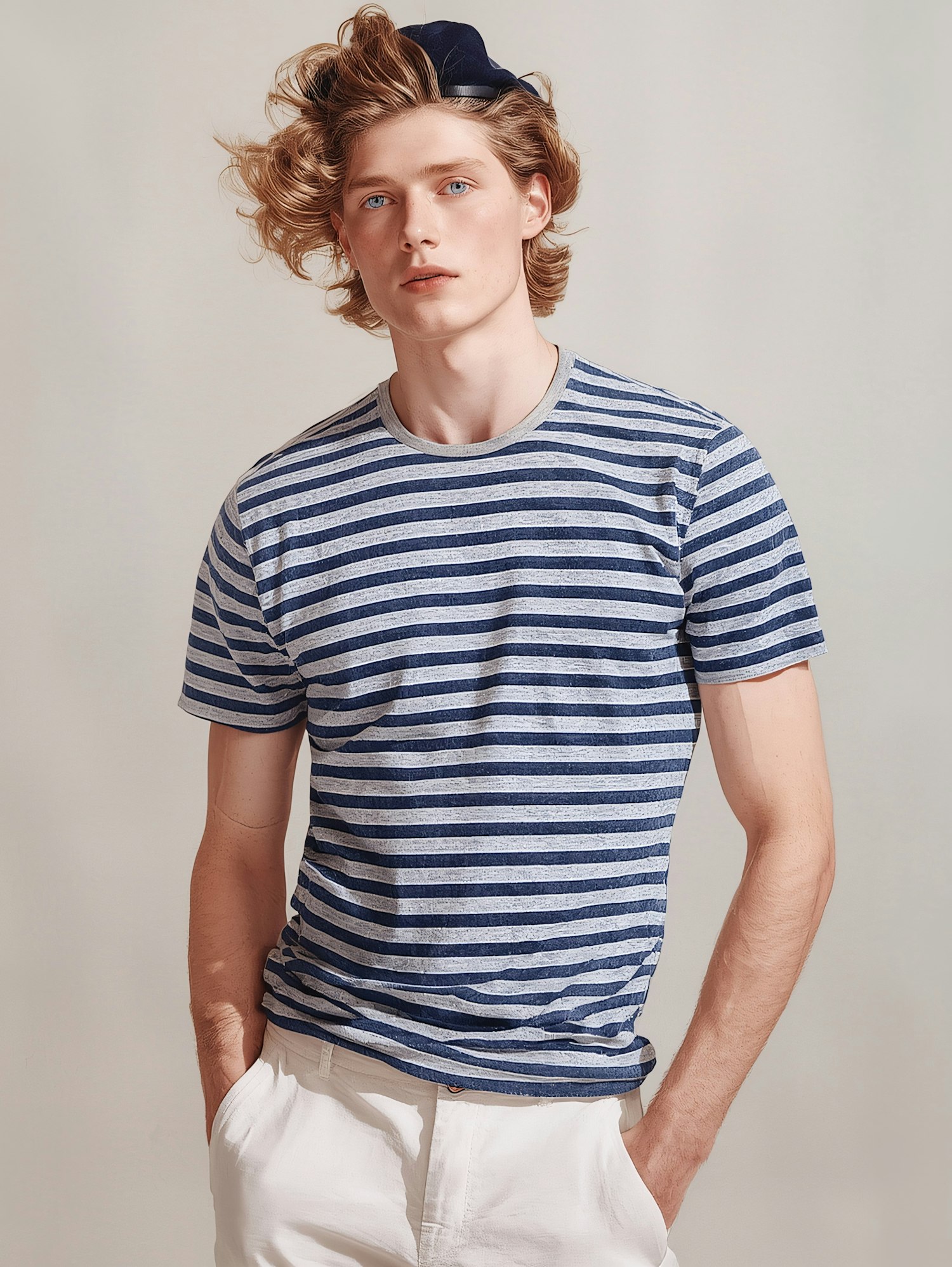 Casual style with a navy striped t-shirt and white pants, perfect for a relaxed and stylish summer look.