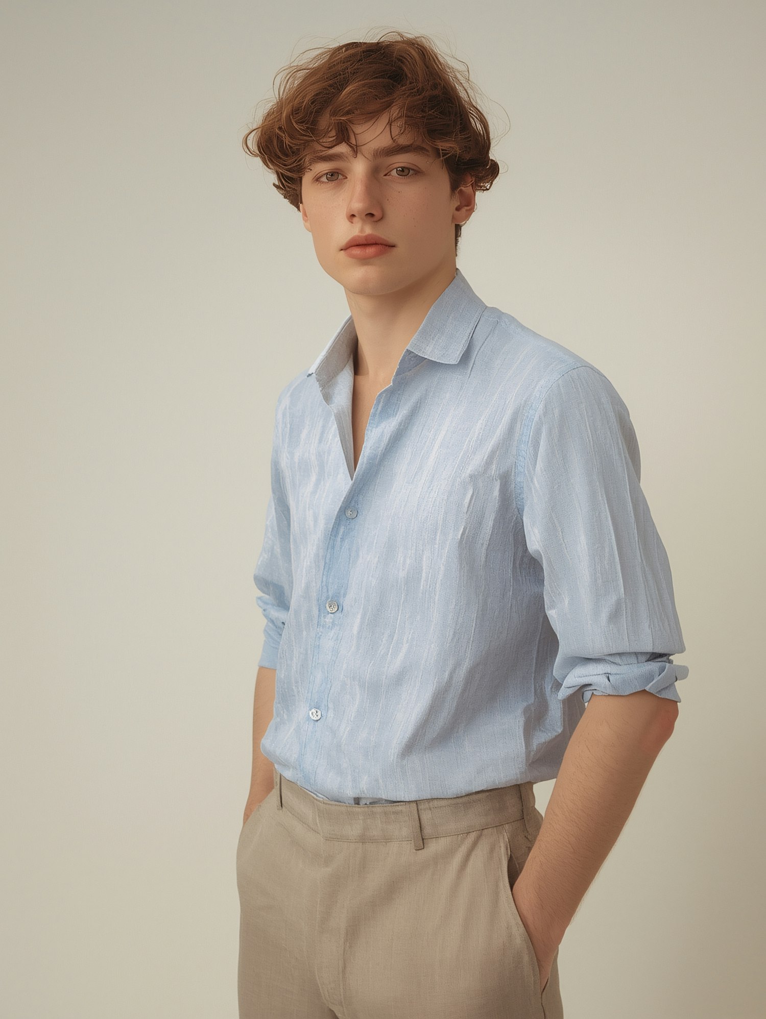 Young man in a light blue shirt and beige trousers, standing against a plain background with a relaxed and stylish demeanor.