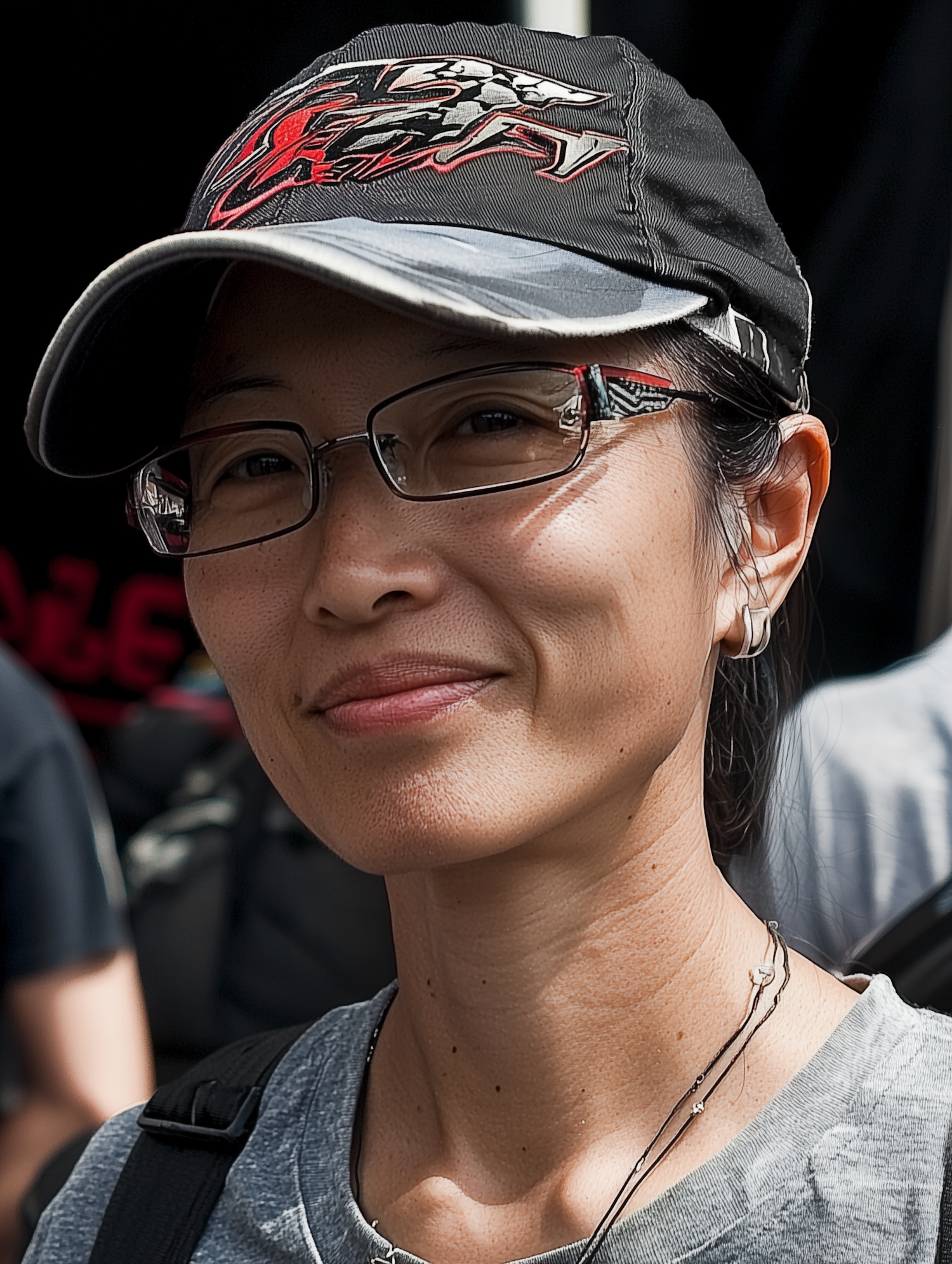 Asian woman in a black cap and glasses, smiling slightly in an outdoor setting. She wears a gray shirt and a necklace.