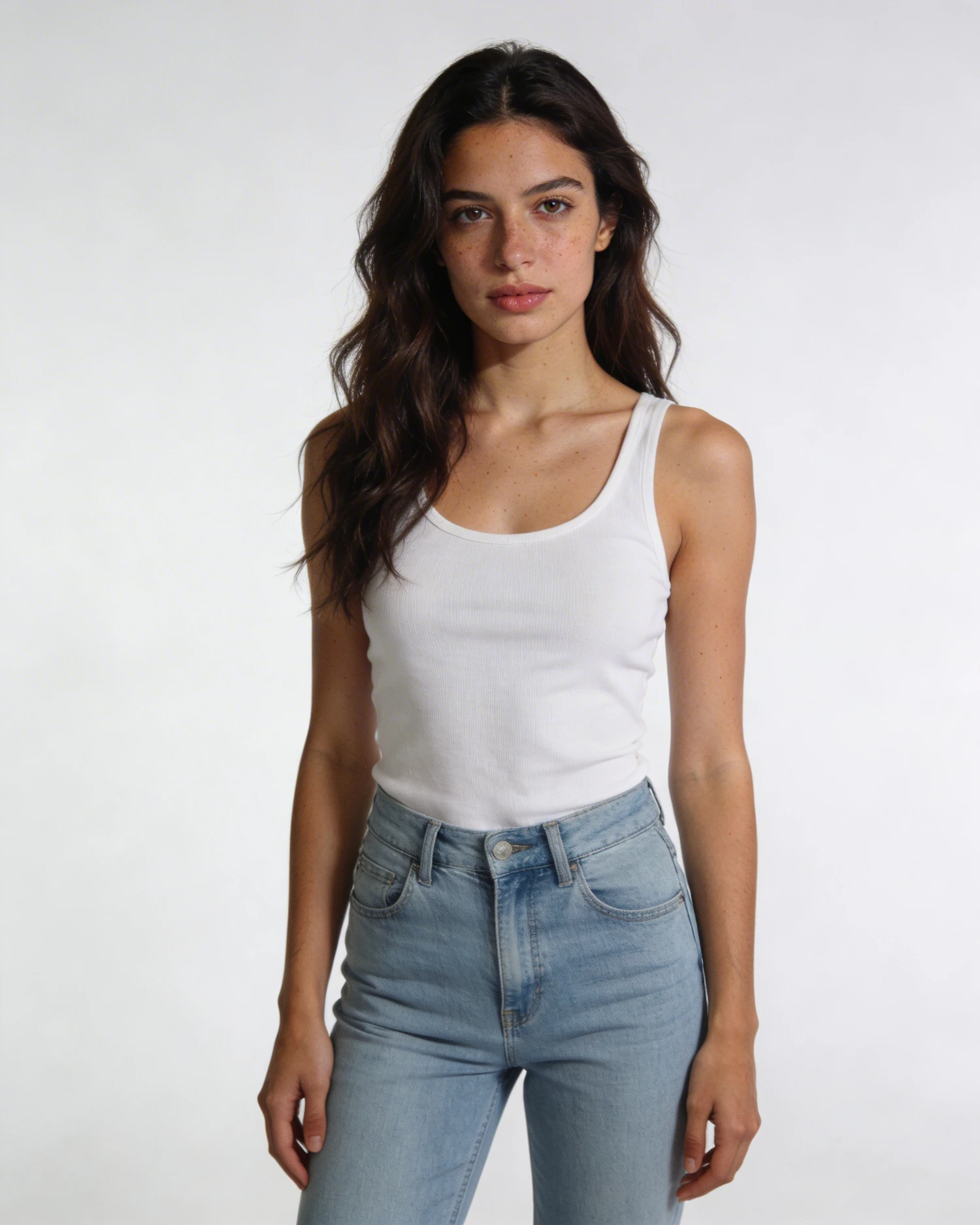 Ultra realistic studio fashion photography, young woman around 25 years old, Mediterranean features, long dark brown slightly wavy hair, natural glowing skin with visible pores and subtle imperfections, soft natural makeup, slim silhouette, long legs, relaxed confident posture, standing straight facing camera, arms relaxed along body, neutral calm expression, wearing simple fitted white tank top and light blue high-waisted jeans, white seamless studio background, soft diffused lighting, minimal shadows, neutral color balance, commercial model test shoot aesthetic, 85mm lens look, high detail, natural proportions