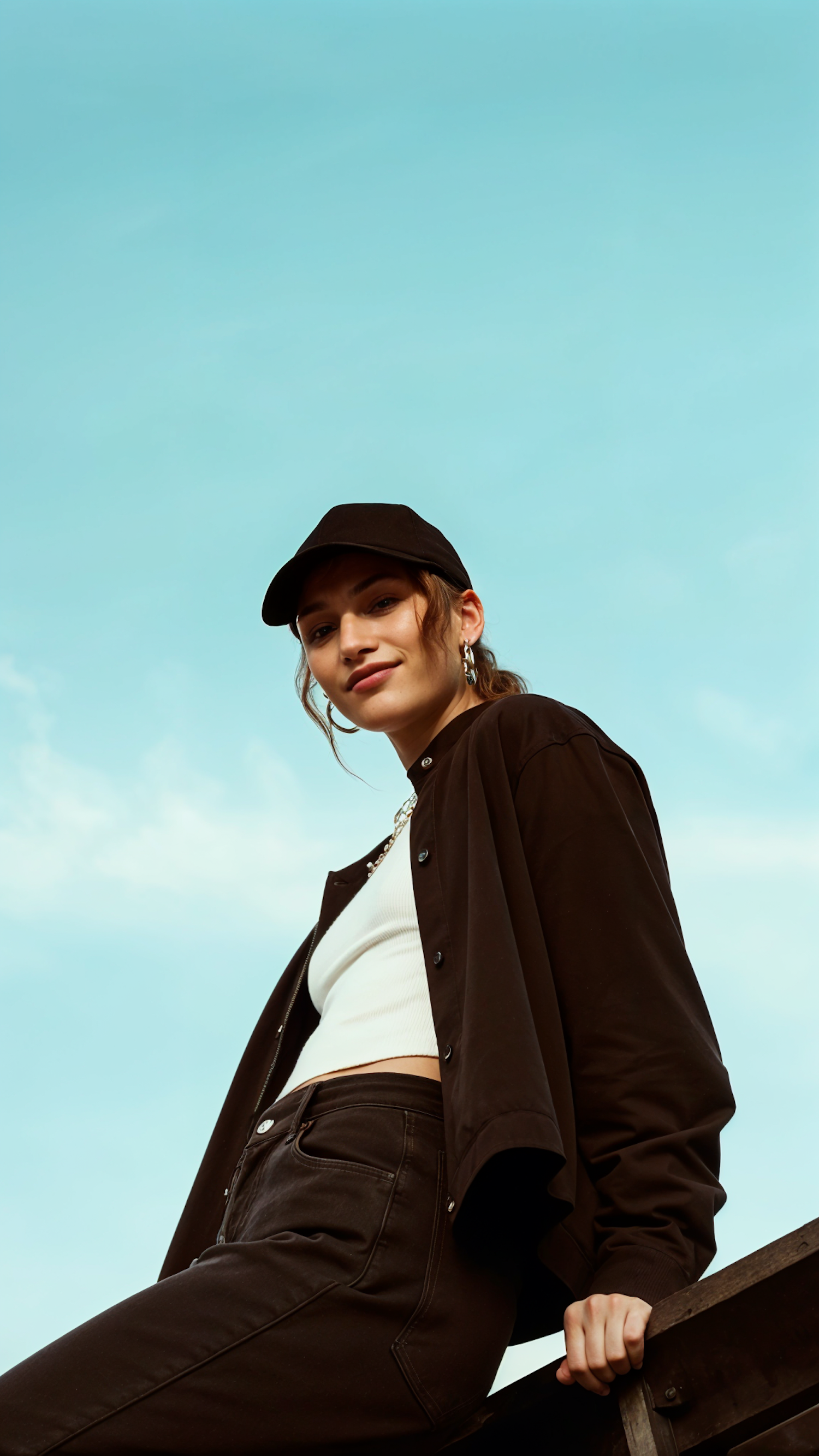 Young woman in casual attire with a black cap and jacket, sitting against a clear blue sky, exuding confidence and style.
