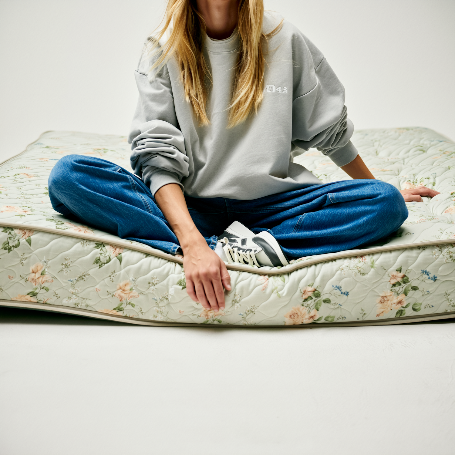 Casual scene of a person sitting cross-legged on a floral mattress, wearing a gray sweatshirt, blue jeans, and white sneakers.