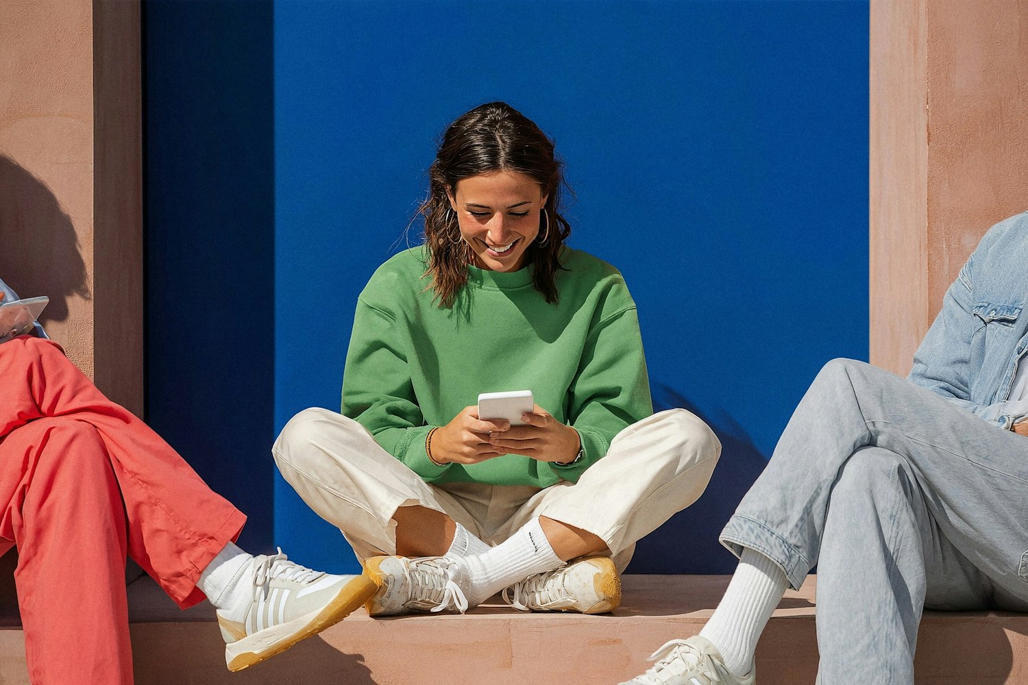 A young woman in a green sweatshirt smiles while using her phone, seated against a vibrant blue background with friends nearby.