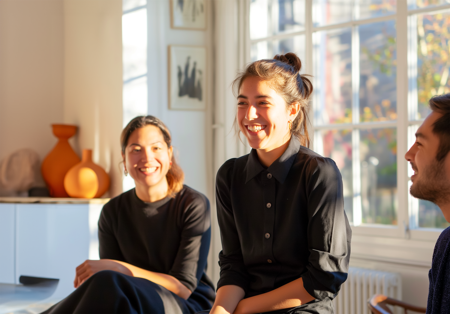 Three friends share a joyful moment in a sunlit room, surrounded by art and decor, creating a warm and inviting atmosphere.