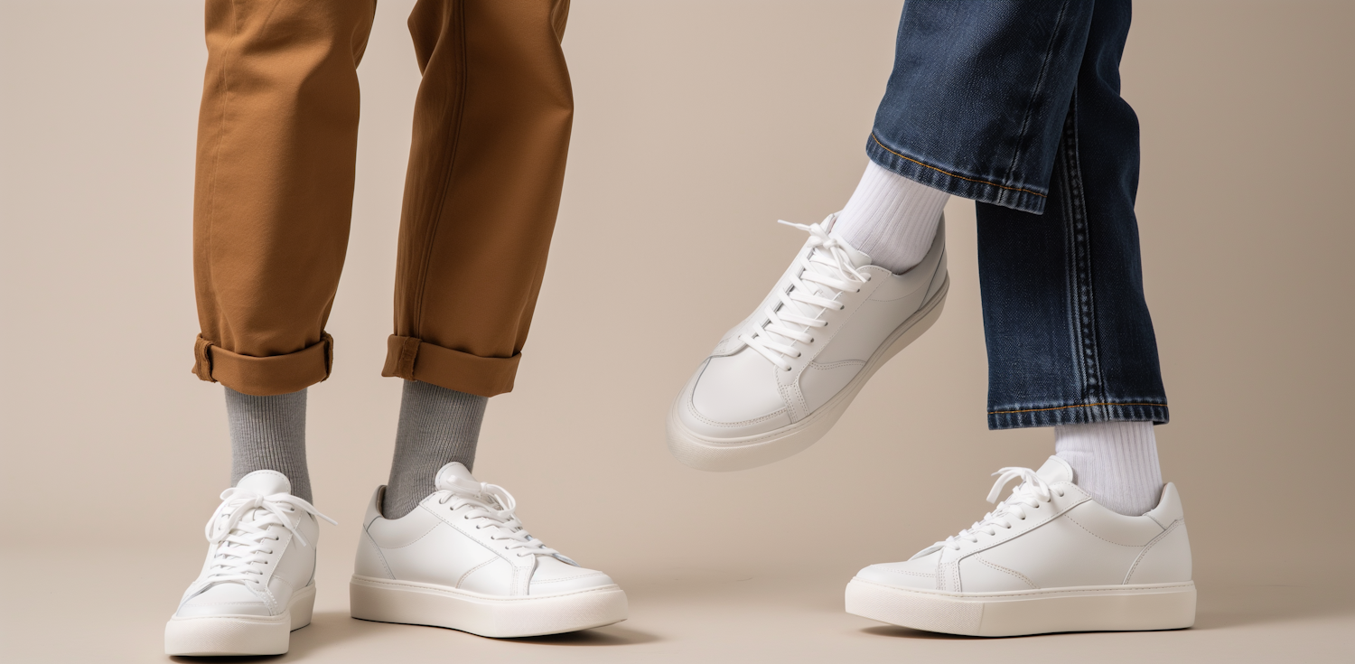 Stylish white sneakers paired with brown pants and blue jeans, set against a neutral beige background for a casual look.