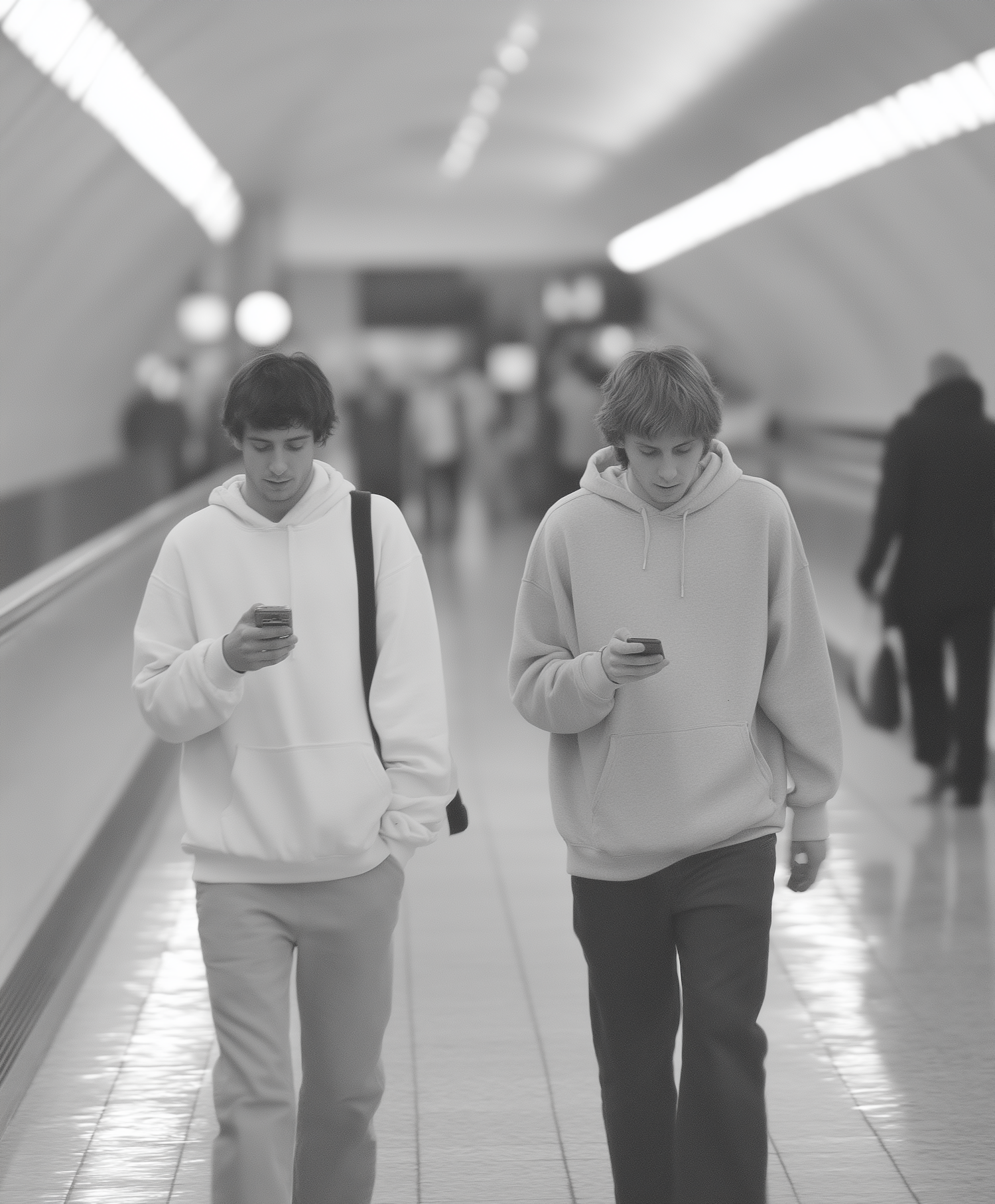 Two young people walking in a modern corridor, both focused on their smartphones, dressed casually in hoodies and pants.