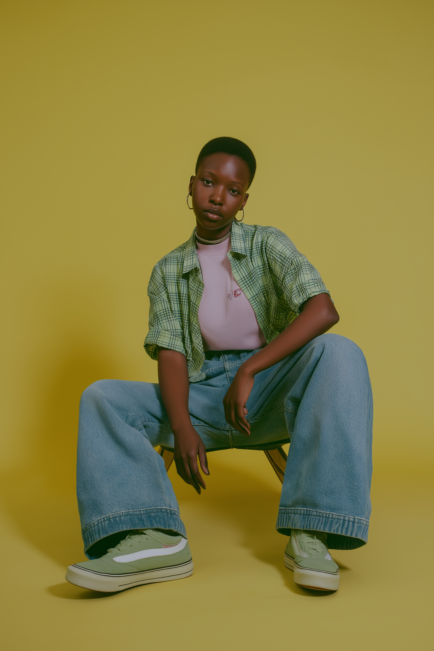 A stylish individual in casual attire sits against a yellow background, showcasing a relaxed and modern look with vibrant colors.