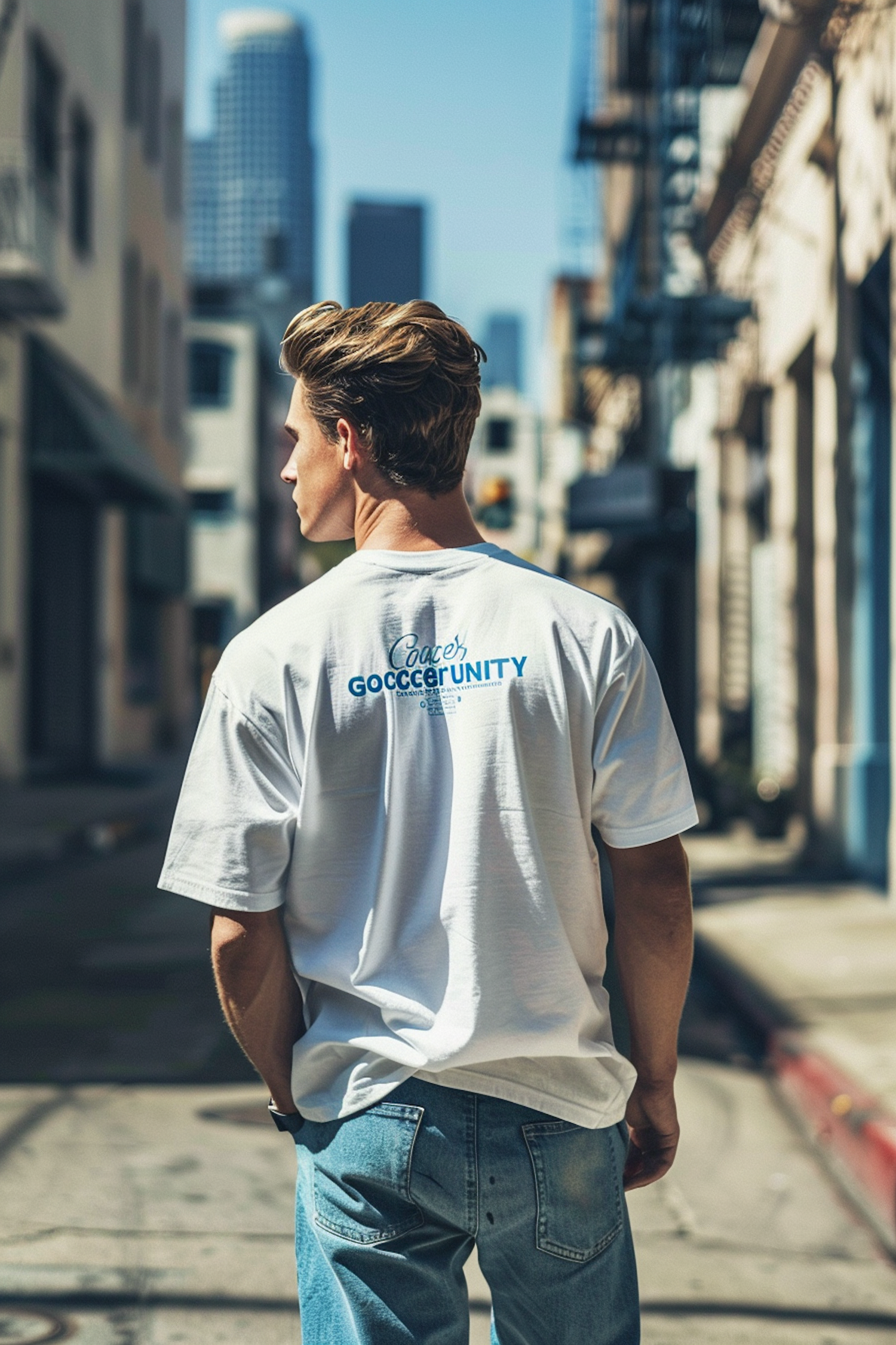 Young man in white T-shirt and jeans walking down a sunny city street, with skyscrapers in the background.