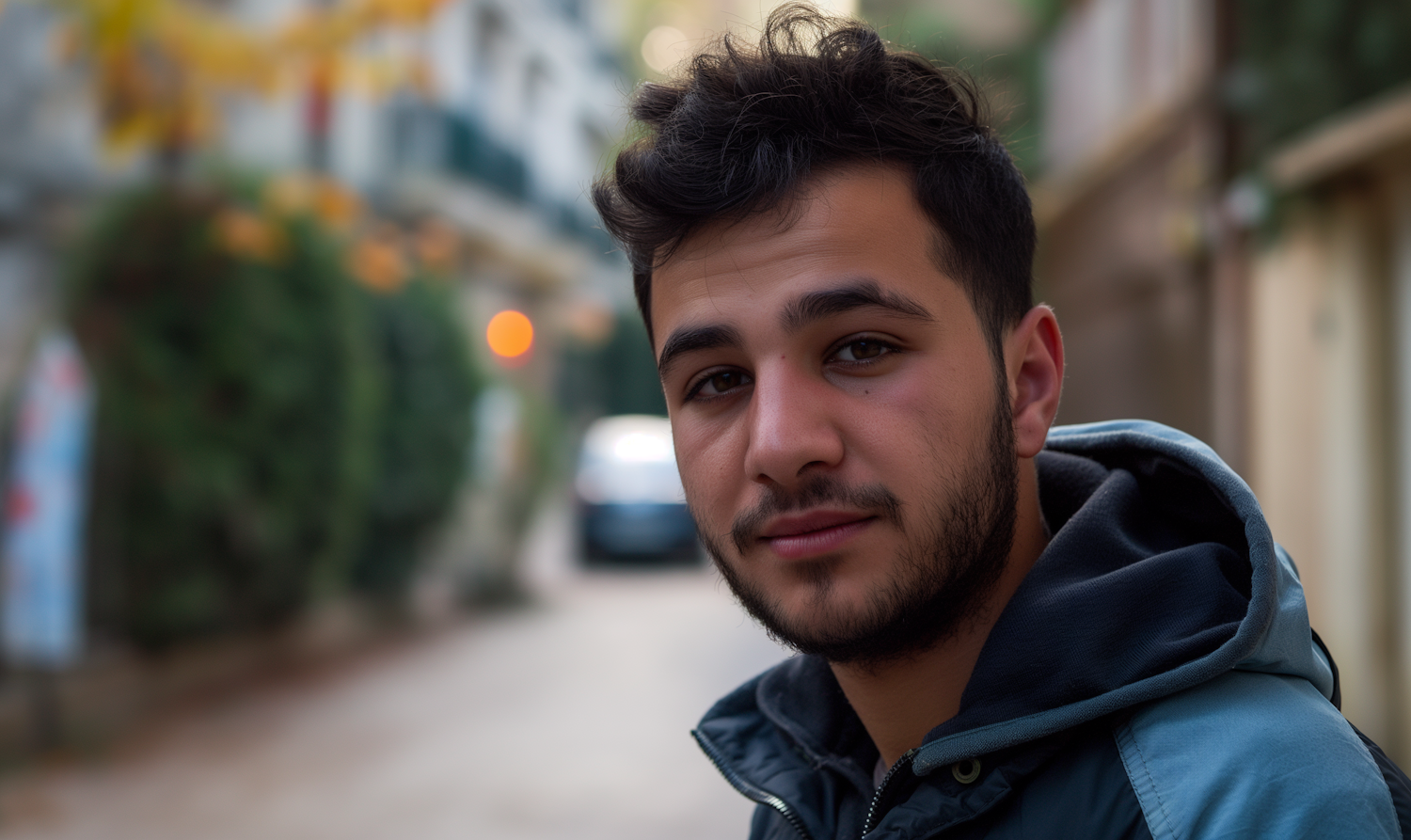 Young man with dark hair and beard in a blue jacket, standing on a blurred urban street. Soft lighting creates a serene atmosphere.