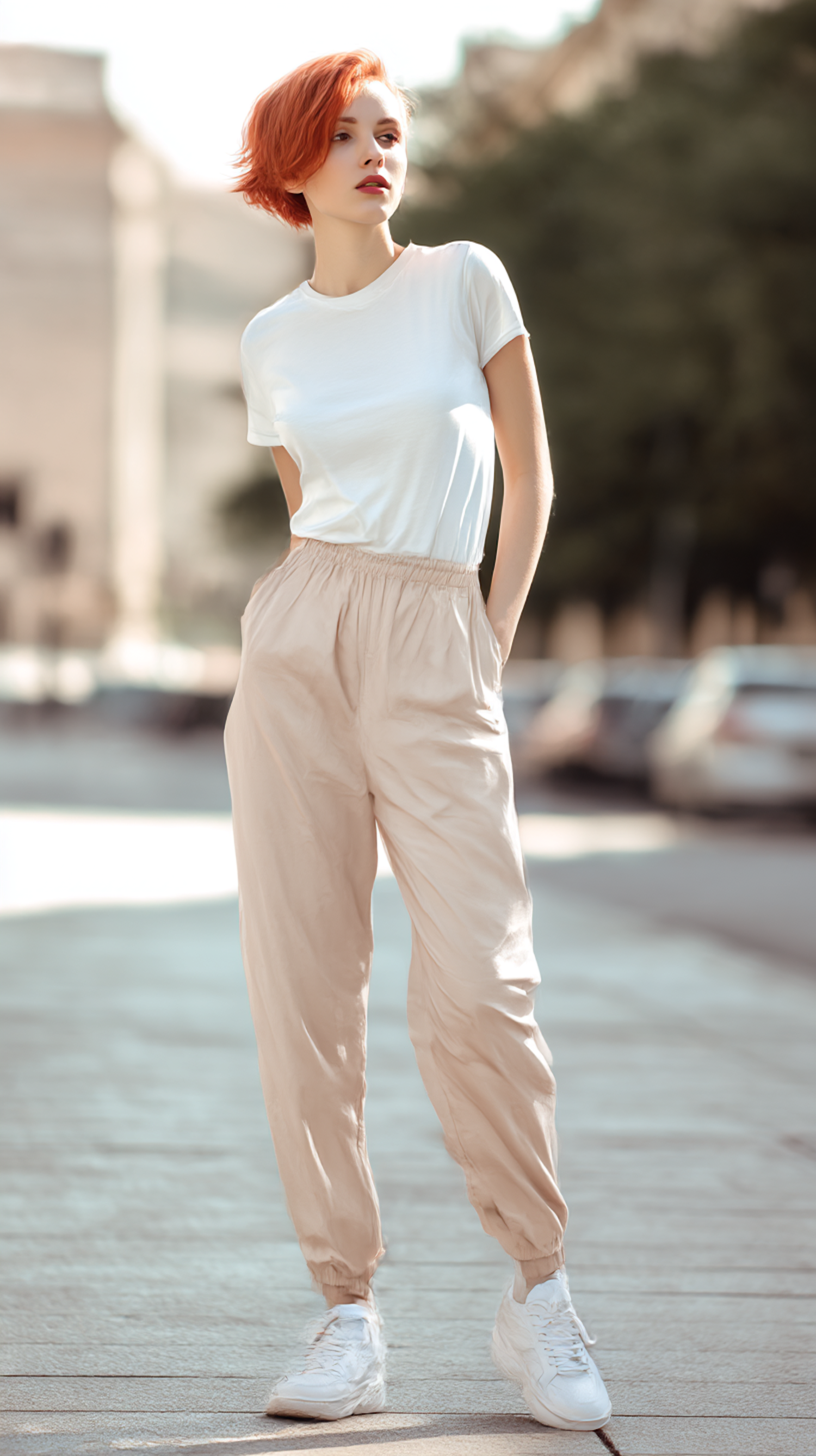 Person with red hair wearing a white t-shirt and beige pants, posing relaxed outdoors in a sunny urban setting.