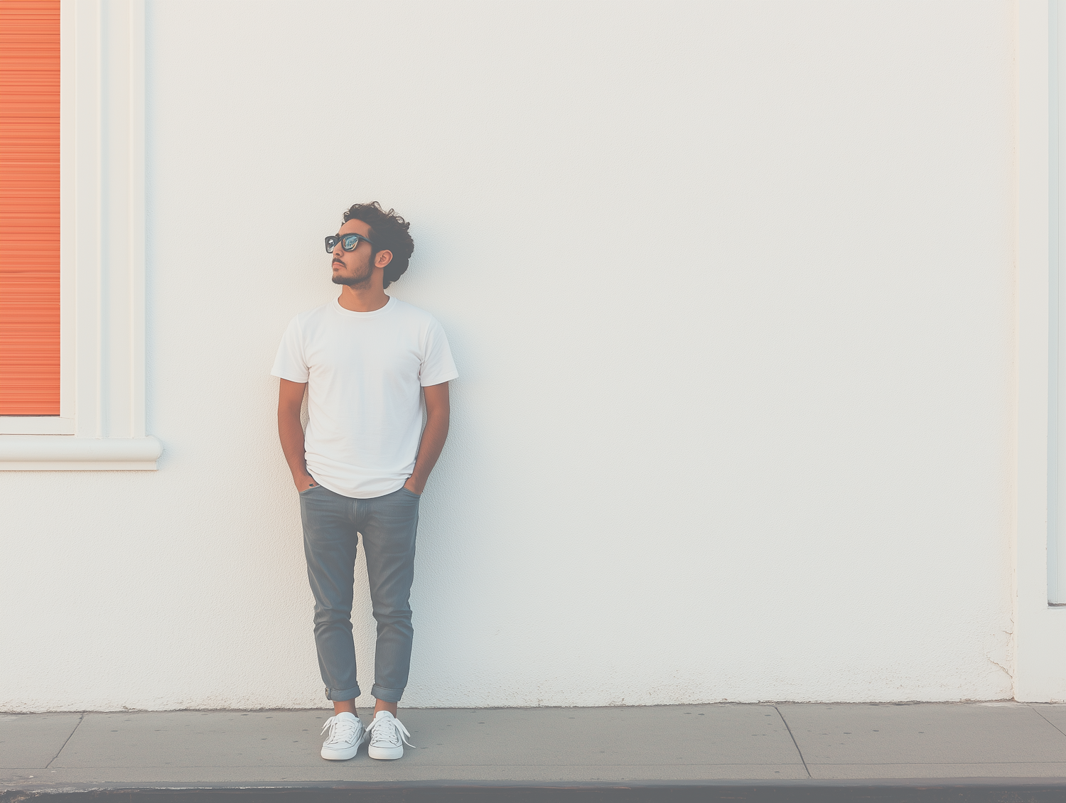 Stylish young man in white t-shirt and jeans stands against a white wall, wearing sunglasses and sneakers, with an orange window frame nearby.