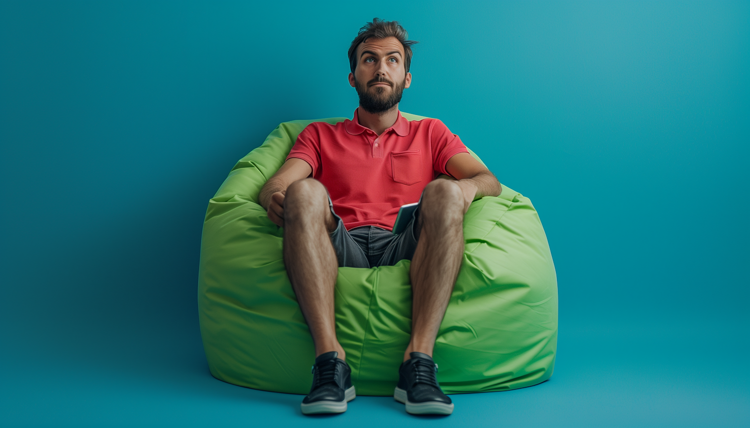 Man in red polo shirt sitting on a green bean bag against a teal background, looking thoughtful.