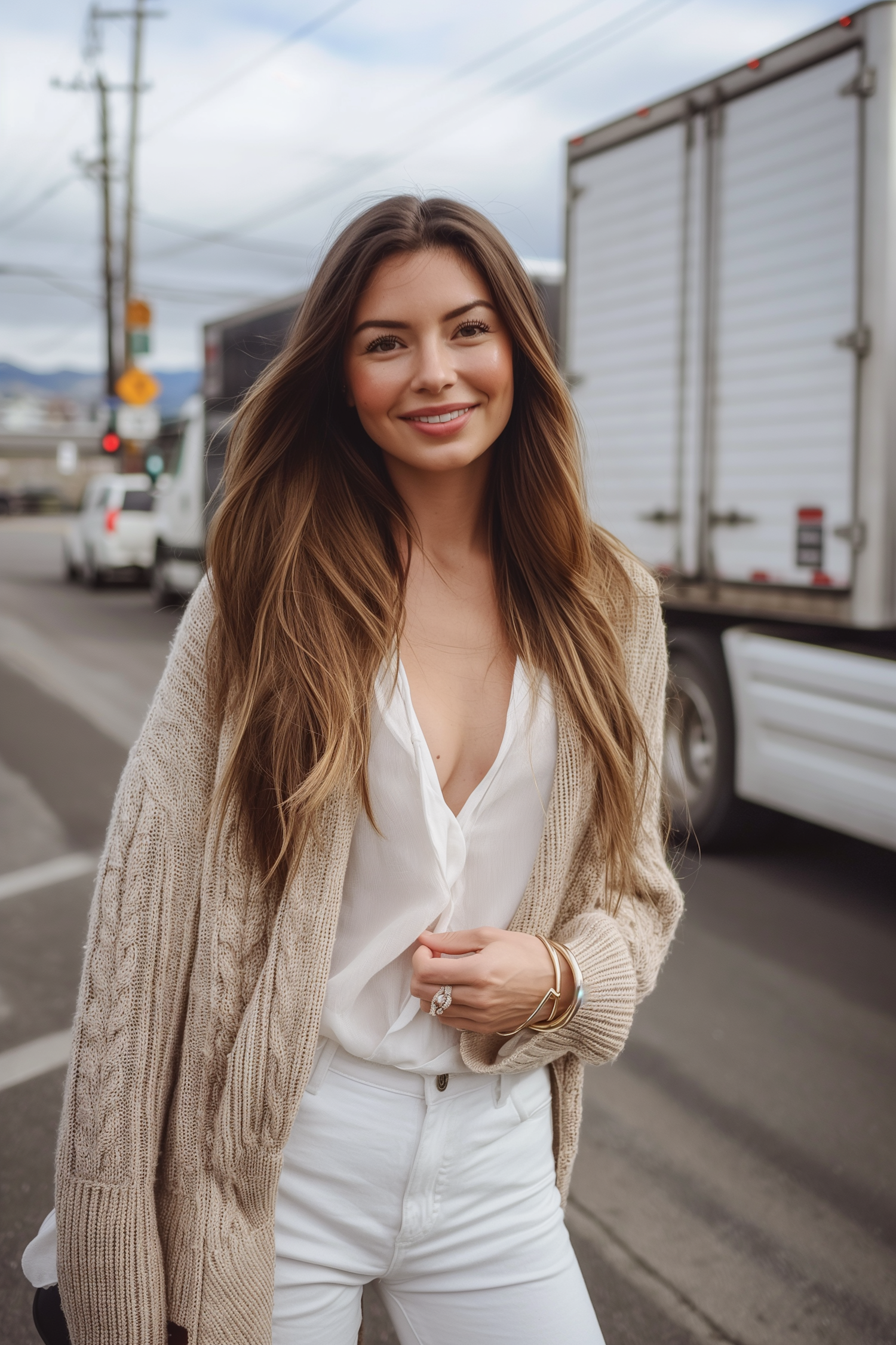 Smiling woman in white blouse and beige cardigan on a street with trucks, showcasing casual elegance and style.