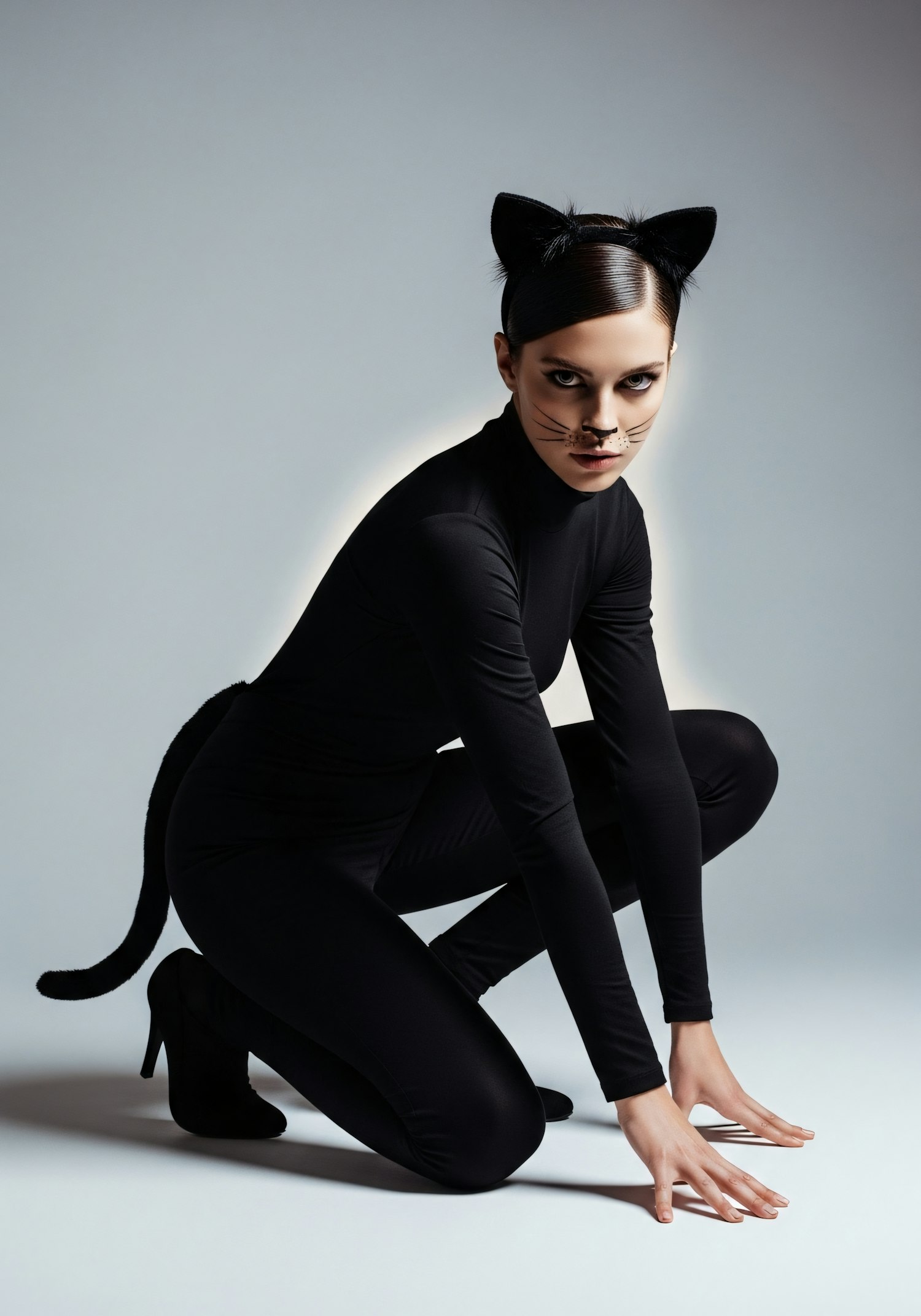 A person in a black cat costume crouches on a light background, featuring cat ears, a tail, and feline makeup for a sleek, dynamic look.